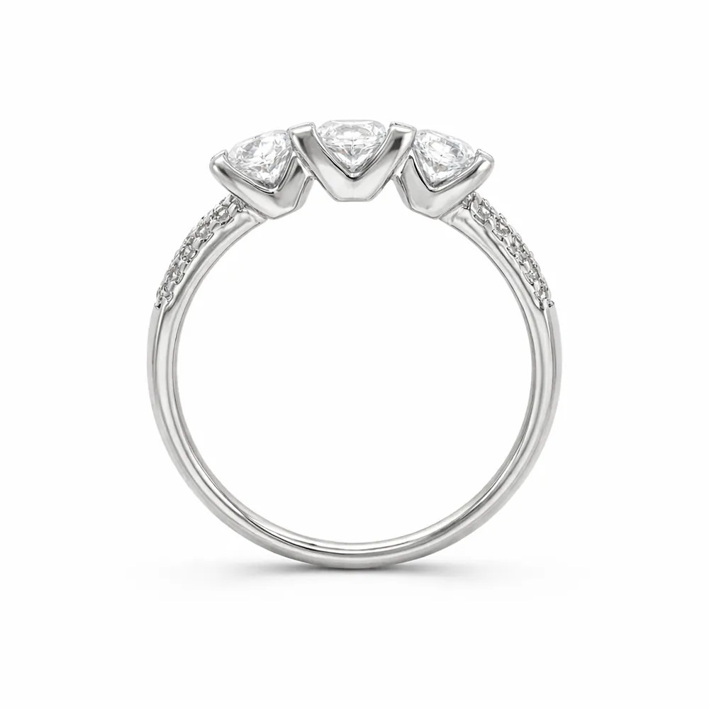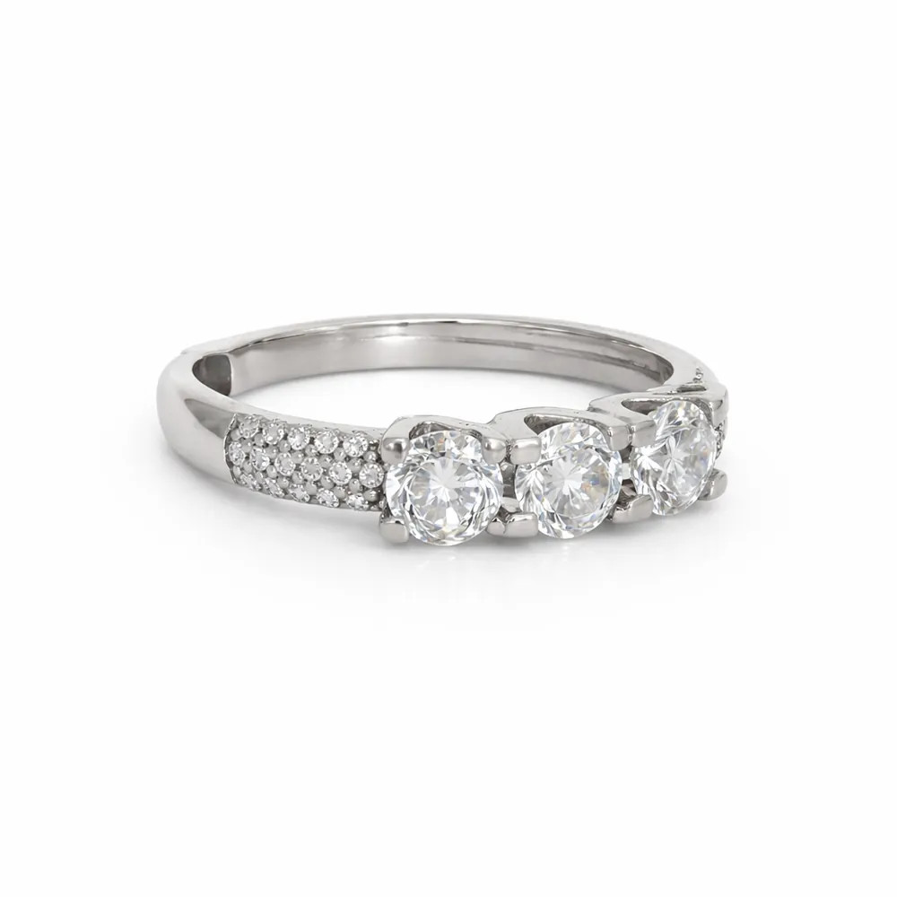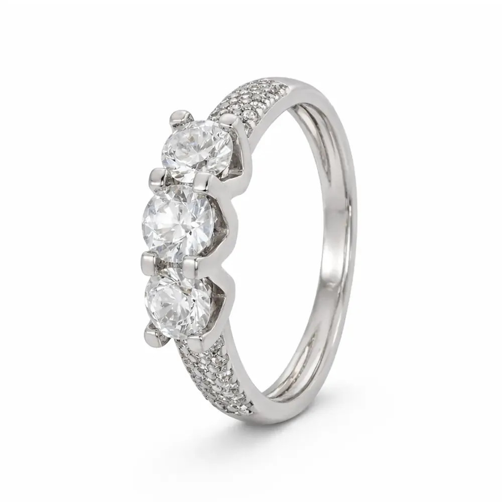 Ragyogó részletek és hangsúlyos középpont – három kiemelt cirkon kő 4 karmos foglalatban, az oldalsó részen apró kövekkel gazdagon díszítve. Elegáns választás különleges alkalmakra.
