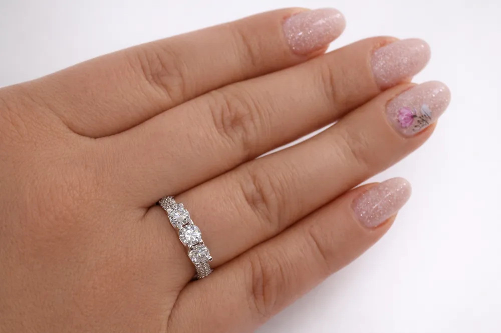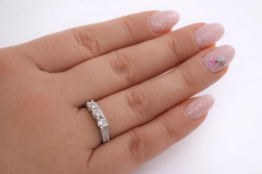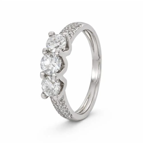 A 14 karátos fehér arany gyűrű kifinomult arányaival és gazdag kődíszítésével azonnal magára vonja a tekintetet. A központi részen 3 db cirkon kő kapott helyet, mindegyik klasszikus 4 karmos foglalatban, amely biztos tartást és kiemelkedő fényjátékot biztosít.