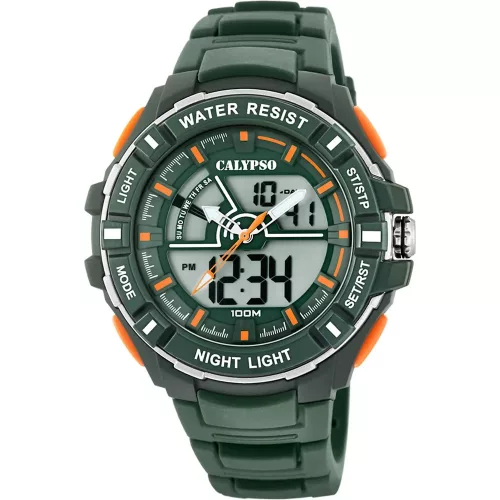 Calypso K5769/5 ana-digi tinióra zöld-narancssárga számlappal és zöld műanyag szíjjal. Funkciók: stopper, visszaszámlálás, ébresztés, világítás, 100 m vízálló – fiatalos és funkcionális, eredeti csomagolásban.