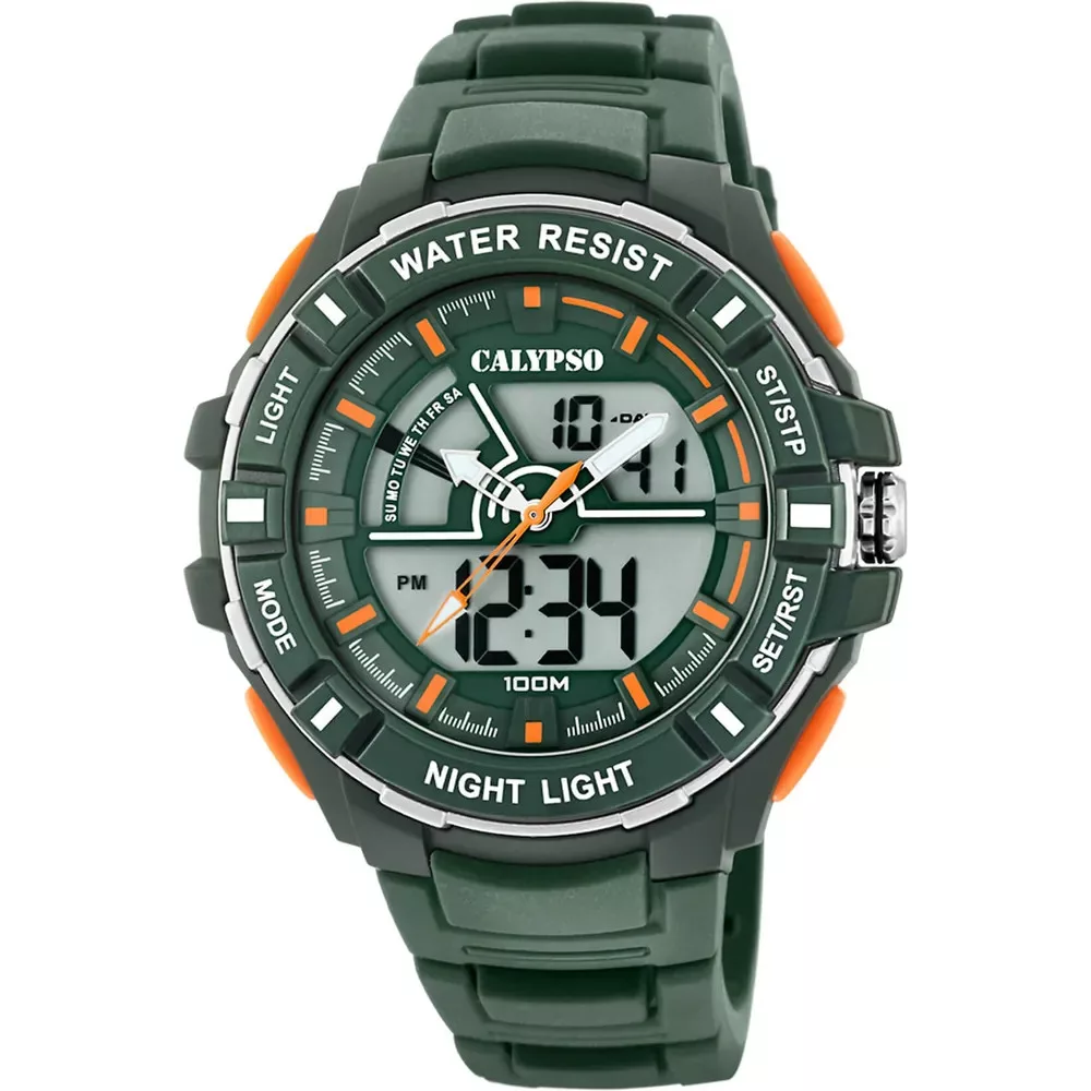 A Calypso K5769/5 analóg-digitális tinióra a Street Style kollekcióból az aktív, fiatalos életstílushoz illik: zöld műanyag tok, acél hátlap és élénk zöld-narancssárga együttese dinamikát kölcsönöz a megjelenésnek.