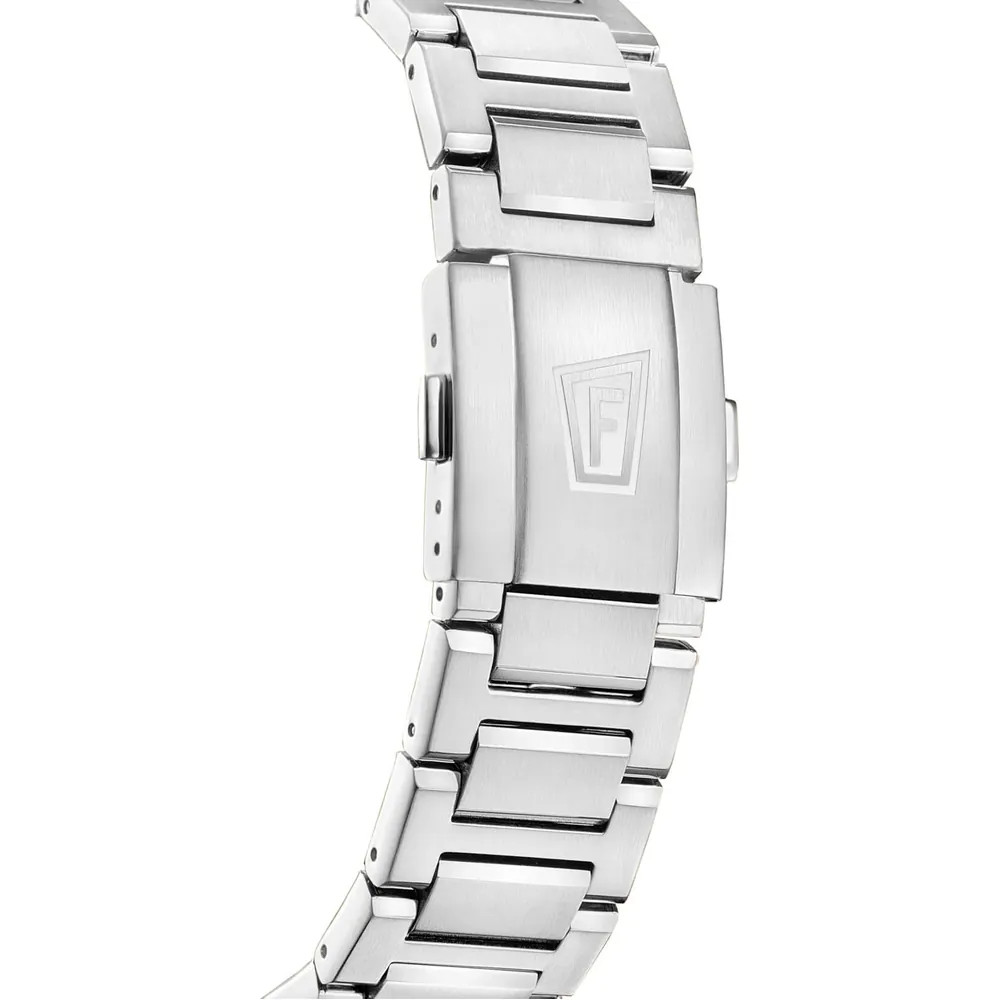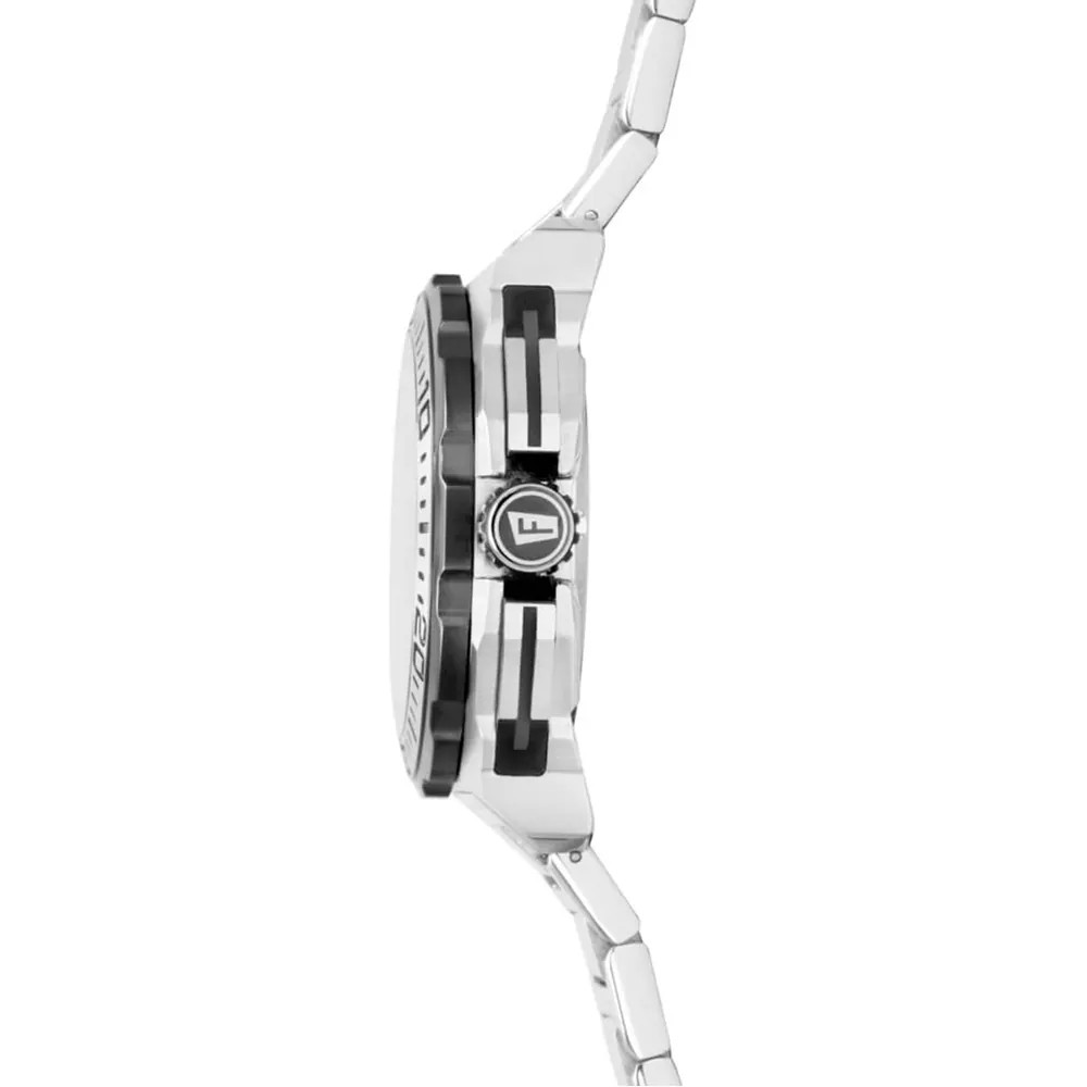 Robusztus és ellenálló 316L rozsdamentes acélból készült tokja maximális védelmet nyújt az ütésekkel, karcolásokkal és korrózióval szemben. Három almutató biztosítja a nagy pontosságú stopperóra funkciót, míg a 6 óránál elhelyezett dátumkijelző praktikus kiegészítője az órának. A számlapon található lumineszcens acél indexek és a nagy, szintén lumineszcens mutatók biztosítják a könnyű leolvashatóságot még gyenge fényviszonyok között is. Keményített ásványiüveg védi a számlapot, a menetes koronának köszönhetően az óra 20 ATM (200 méter) vízállósággal rendelkezik.