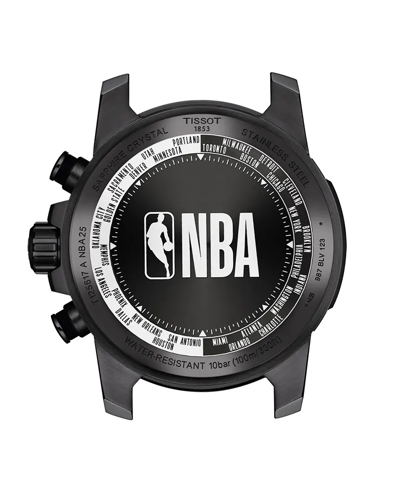Tissot T125.617.37.067.00 egy különleges NBA Special Editon sportos és időtlen svájci férfi karóra fekete PVD bevonattal, stopper funkcióval, az NBA színeivel és fekete hibrid bőr/kaucsuk és extra 2 db szíjjal.