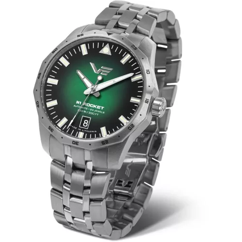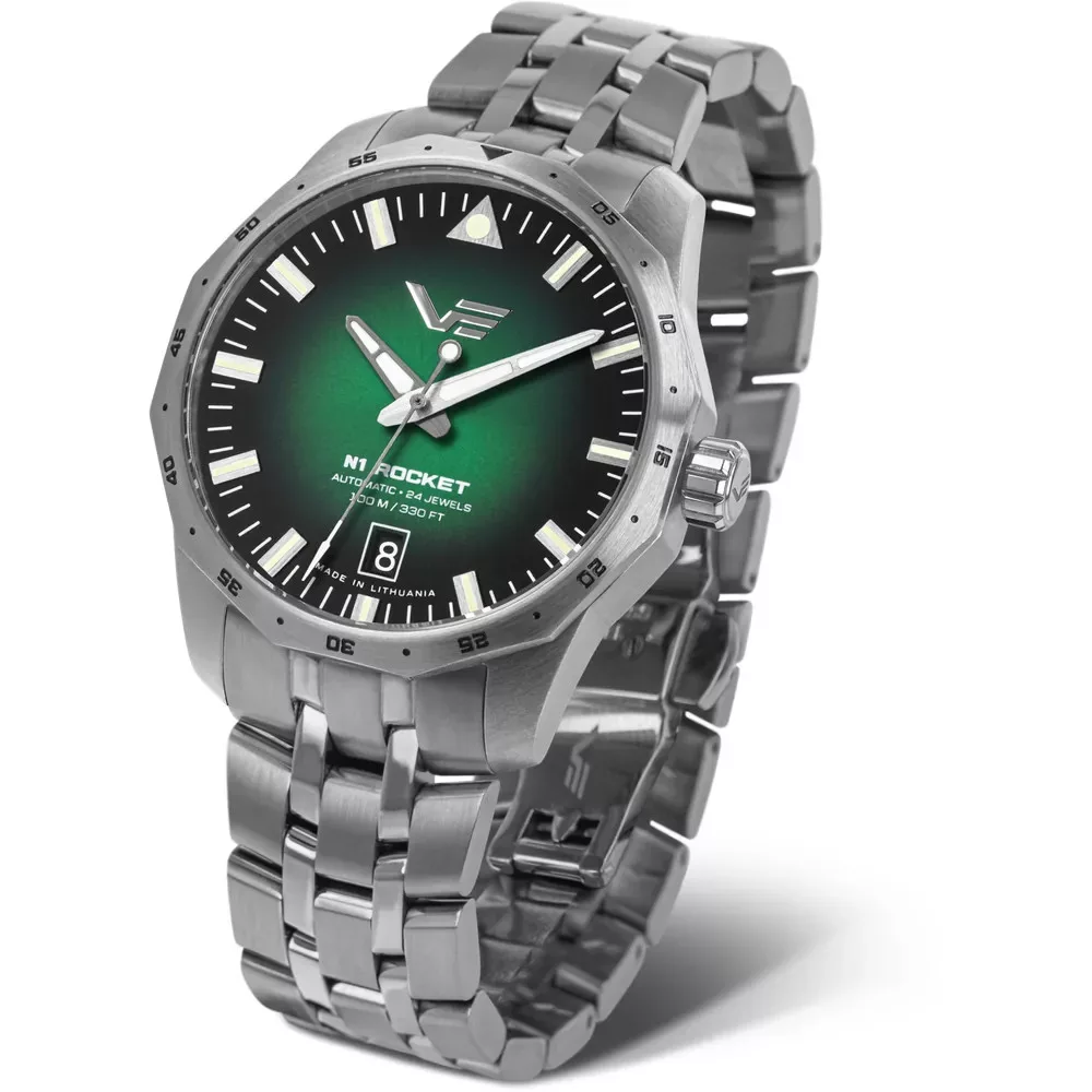 Vostok Europe NH35-125A749-B N-1 Rocket Compact automata óra zöld számlappal. Acél tok, választható fém vagy bőr szíj, 100 m vízálló, NH35 szerkezettel — stílusos, sokoldalú választás.