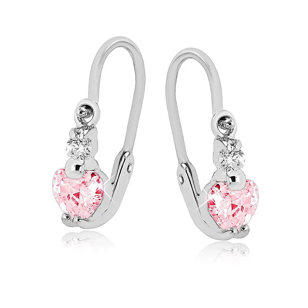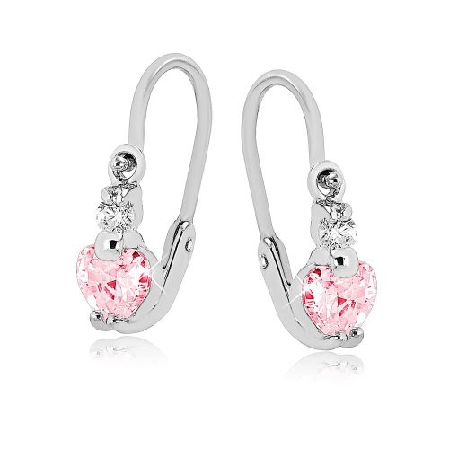 14 karátos fehérarany elölkapcsos baba fülbevaló szív alakú rózsaszín kővel és fehér cirkónia kövessel. 15 mm magas, 4 mm széles, pársúly 1,0 gramm – elegáns, finom megjelenés.