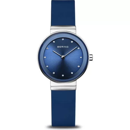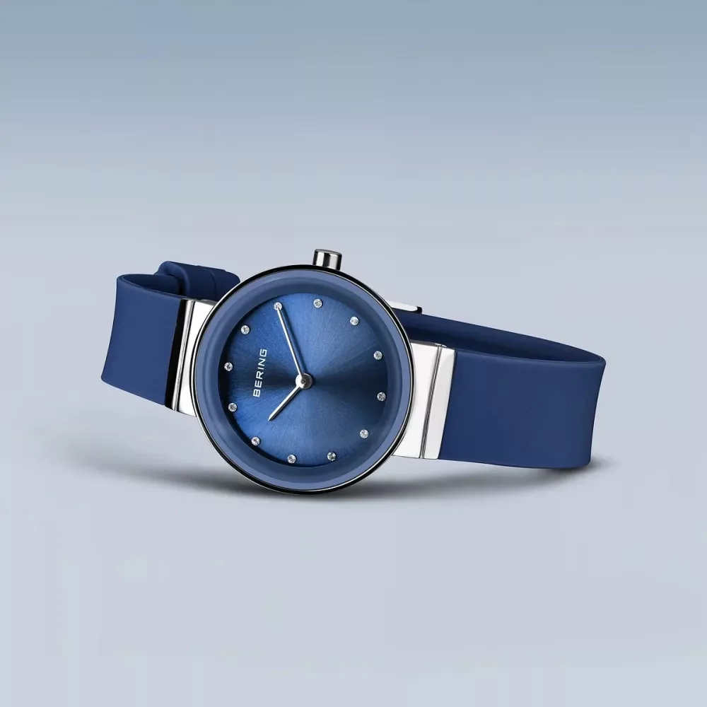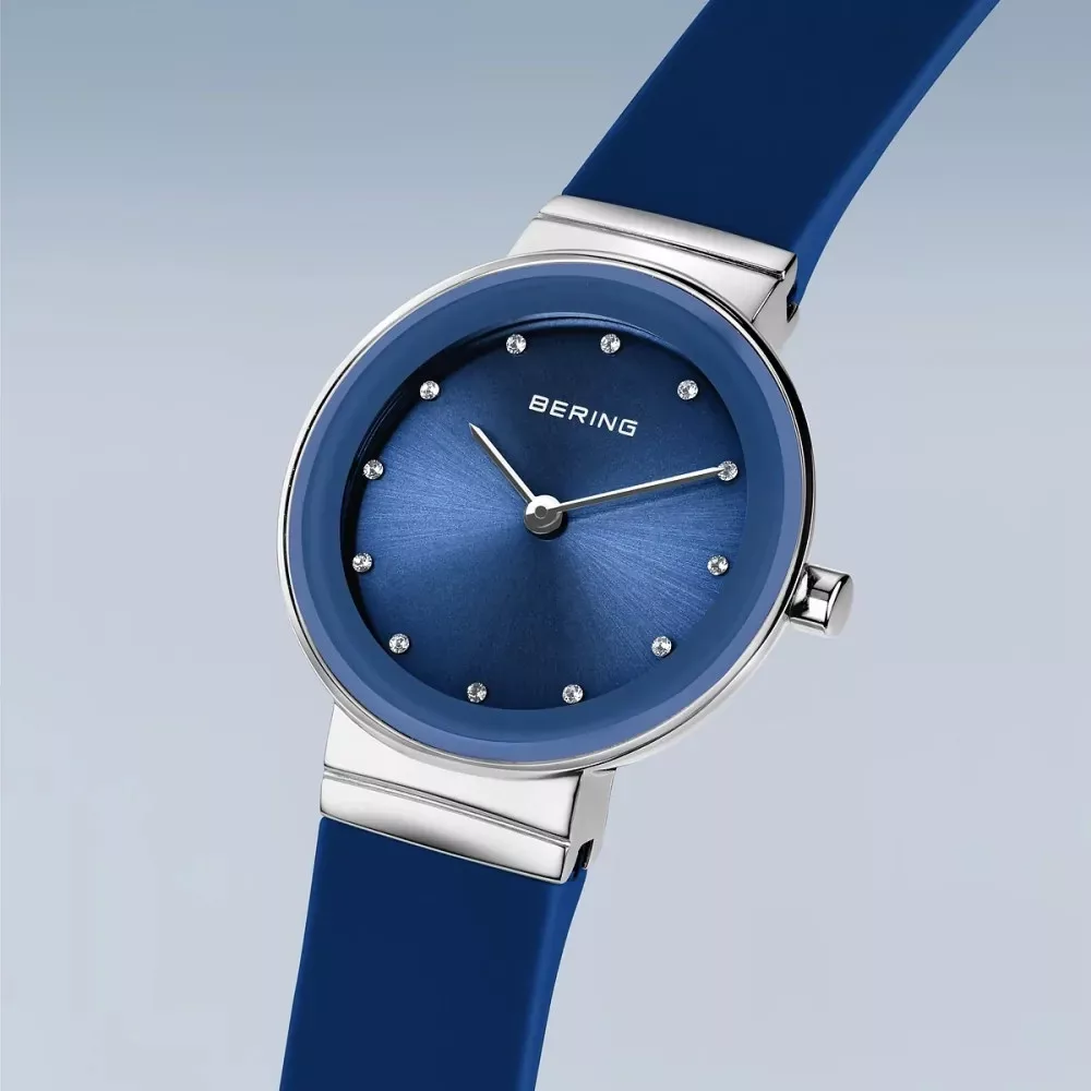 Modern Bering női karóra kék kaucsuk szíjjal és mélykék számlappal. Safír kristályüveg, ultravékony tok, sportos, mégis elegáns megjelenés.