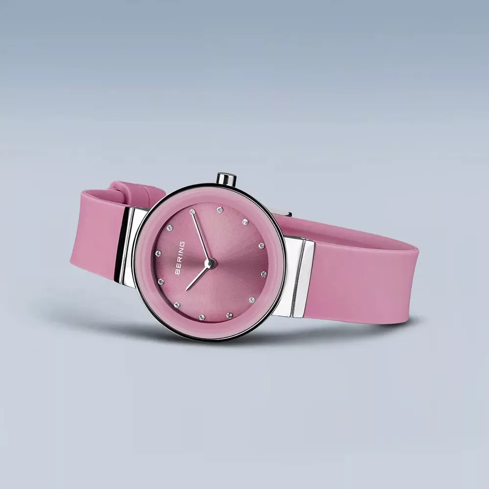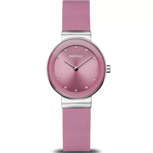 A Bering 10129-909 női karóra üde színfolt a skandináv minimalizmus világában. A finom rózsaszín árnyalatban pompázó kaucsuk szíj és számlap modern, nőies megjelenést biztosít, miközben az ezüst színű rozsdamentes acél tok letisztult eleganciát sugall.