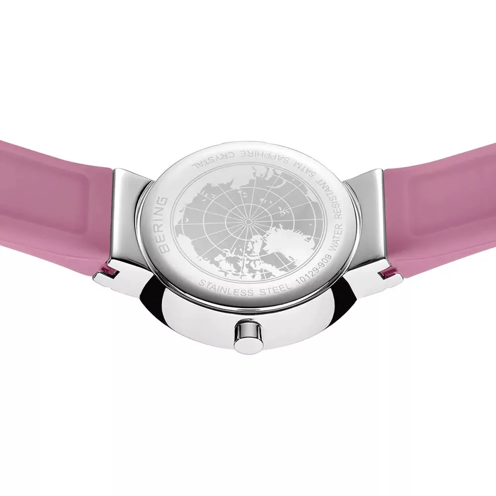 Friss és nőies megjelenés a Bering 10129-909 női karórával: acél tok, rózsaszín kaucsuk szíj és harmonizáló számlap – skandináv stílus, sportos részletekkel.
