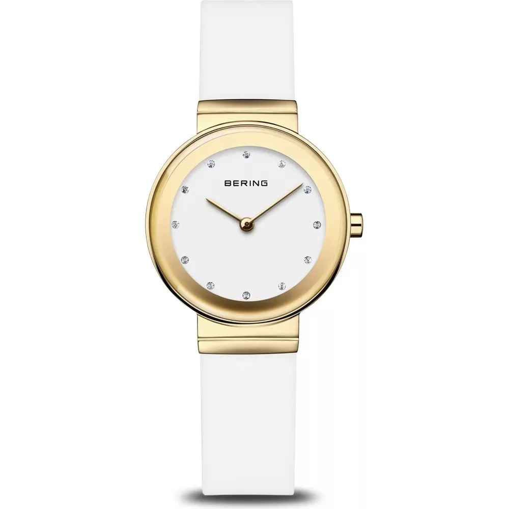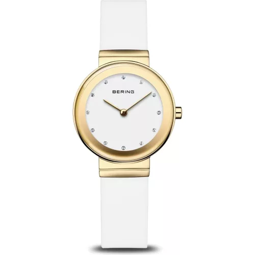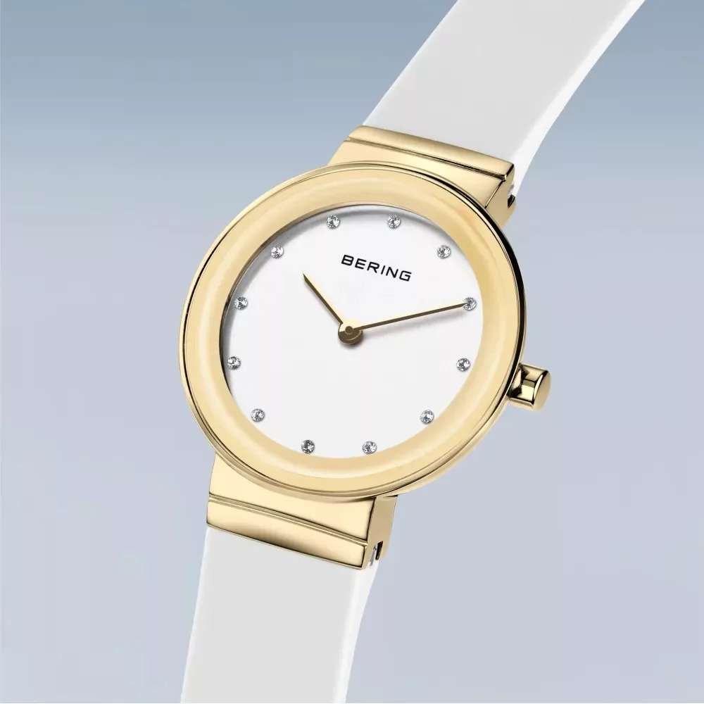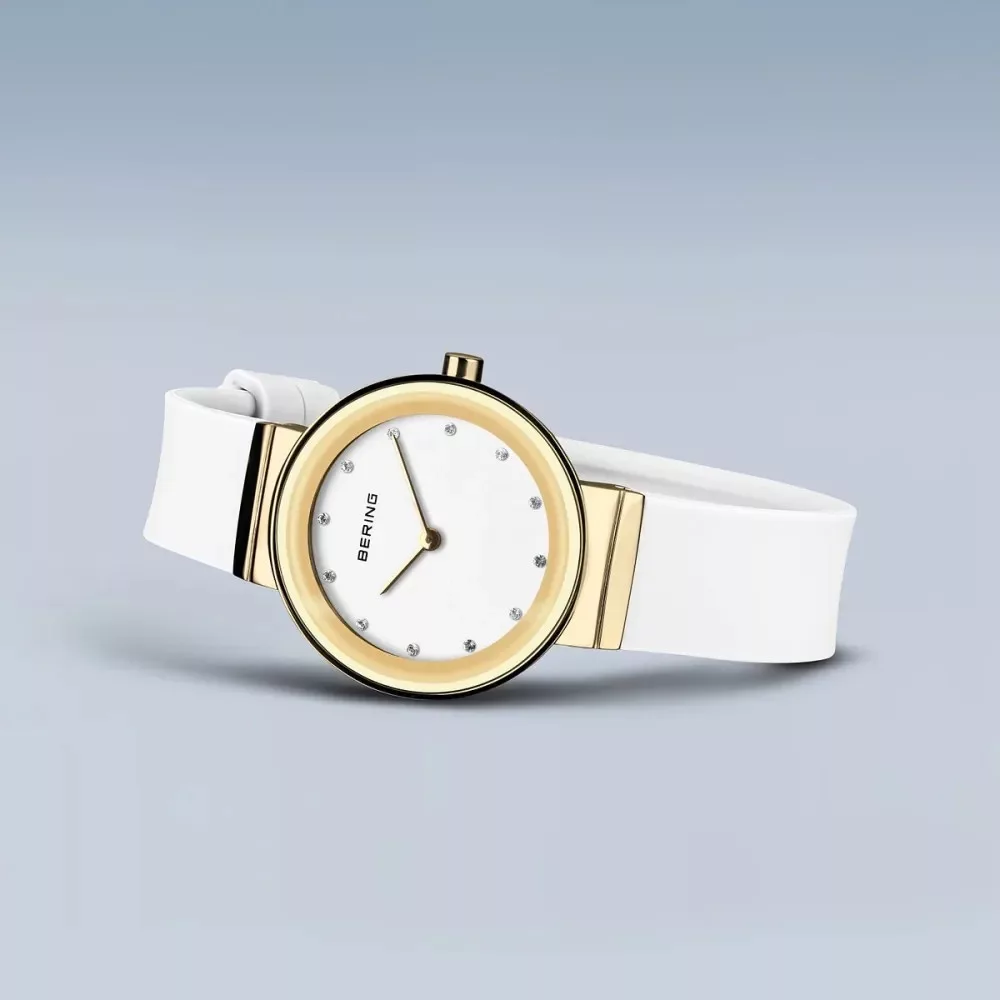 Elegáns és modern Bering női karóra arany színű tokkal, fehér kaucsuk szíjjal és letisztult fehér számlappal. Sportosan nőies megjelenés, safír üveggel.