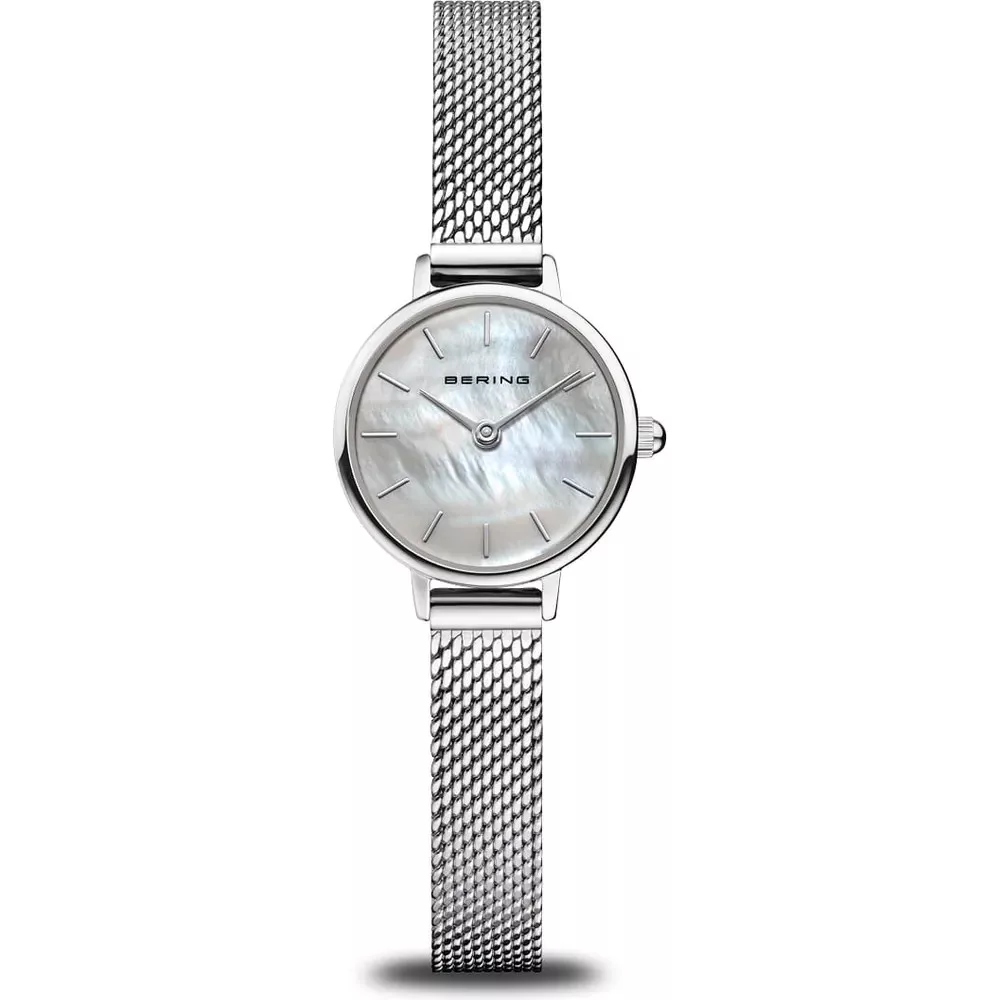 Visszafogott elegancia a Bering 11022‑004 női karórával: 22 mm polírozott ezüst acél tok, ezüst mesh szíj és gyöngyház hatású számlap – precíz quartz szerkezettel.