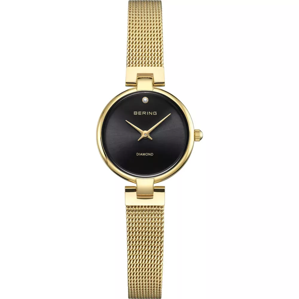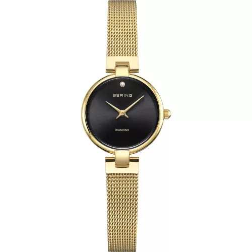 Elegáns Bering női karóra sárga arany színű acél szíjjal, fekete számlappal és valódi gyémántberakással. Safír üveg, quartz szerkezet, letisztult luxus.