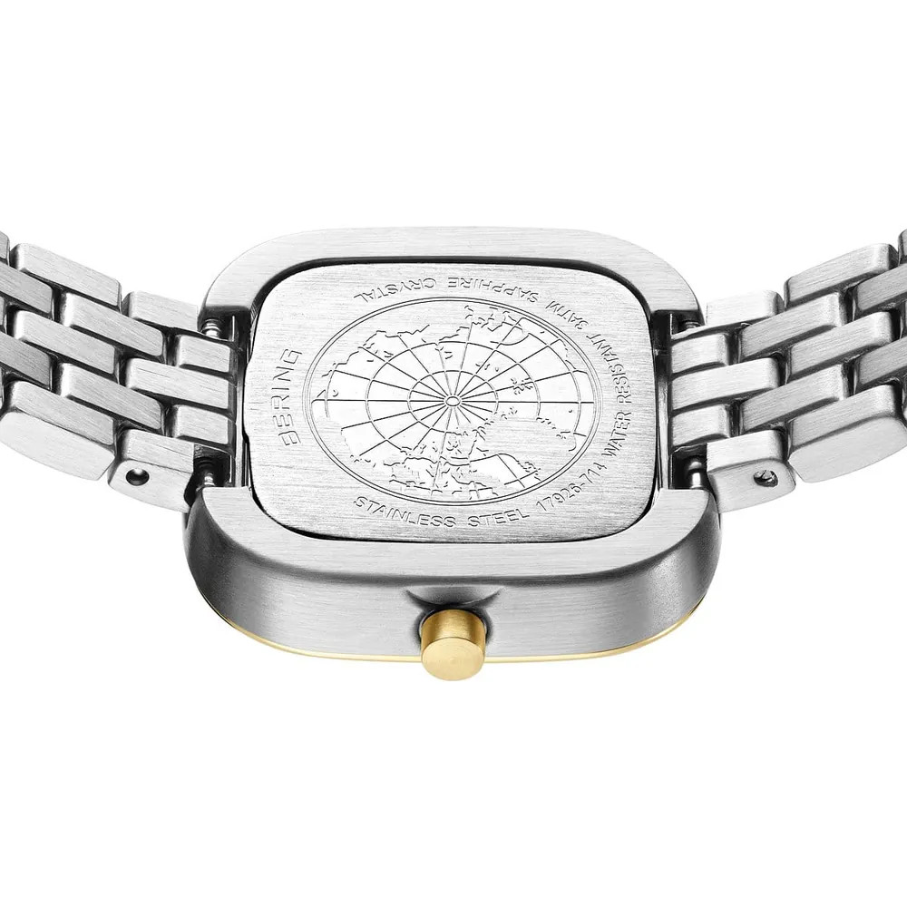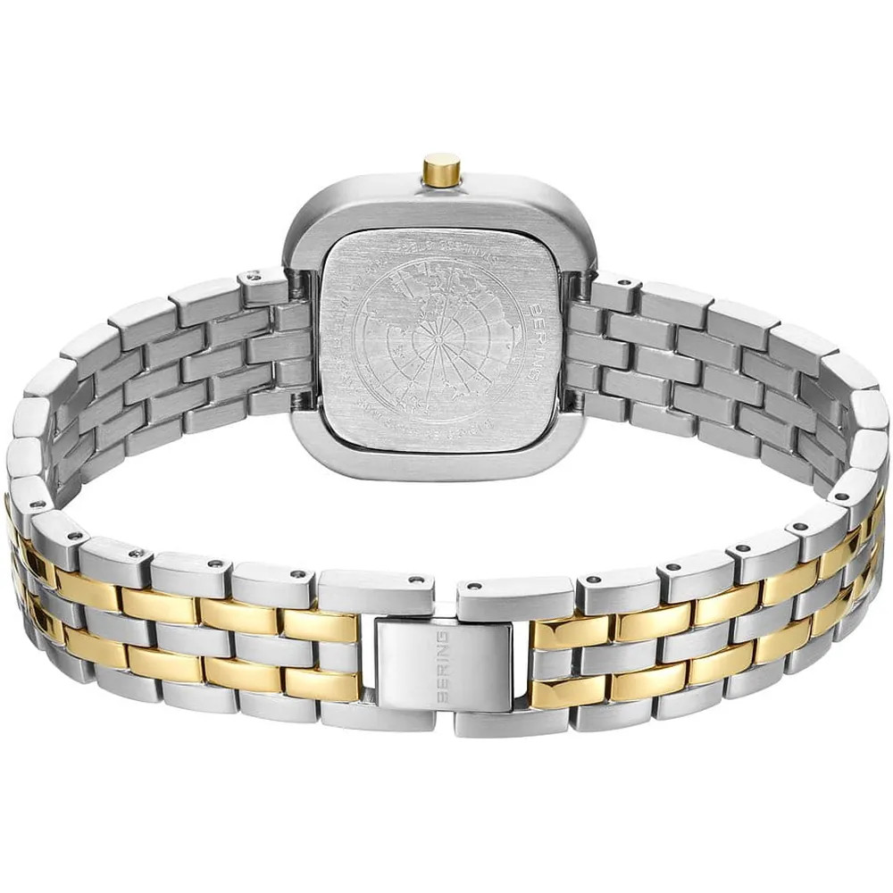 A Bering 17926-714 női karóra a Classic kollekció visszafogott eleganciáját testesíti meg. A 26 mm-es tok és a két tónusú (ezüst/arany) rozsdamentes acél szíj harmonikus, minimalista megjelenést nyújt, mely minden alkalomhoz illik – a mindennapi viselettől az elegáns eseményekig.