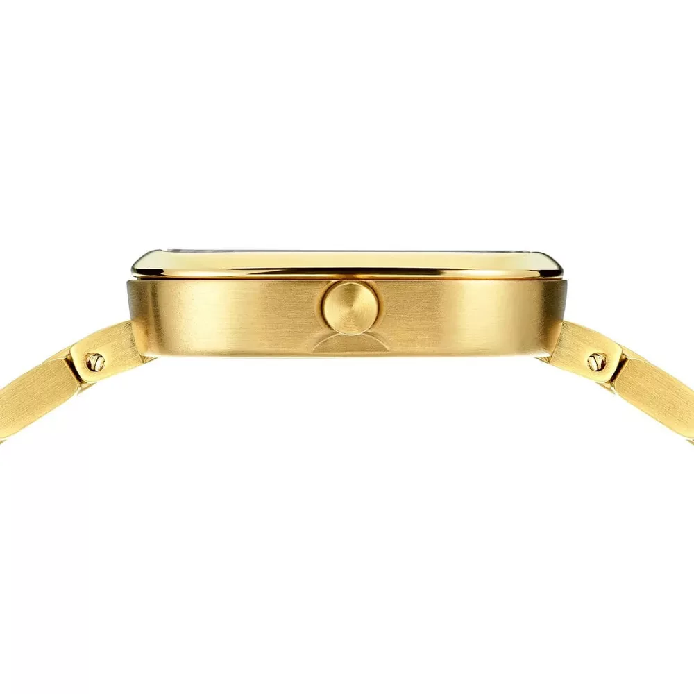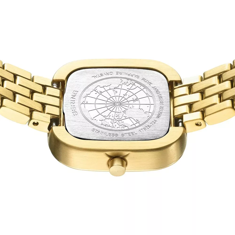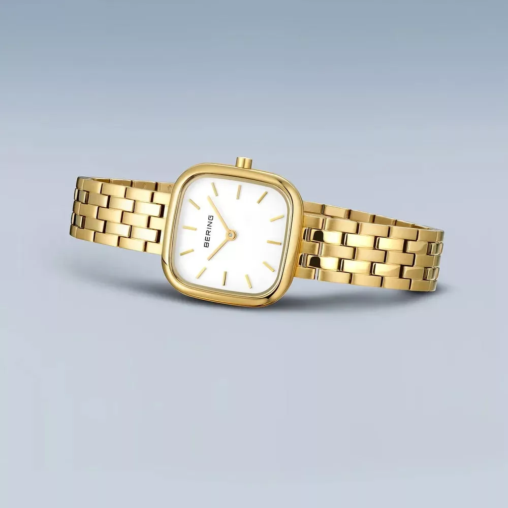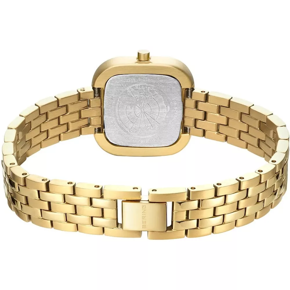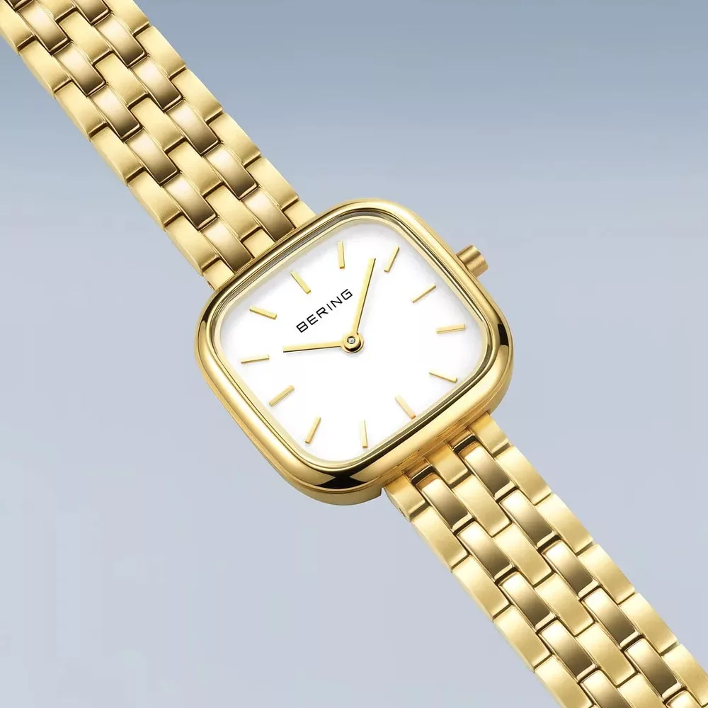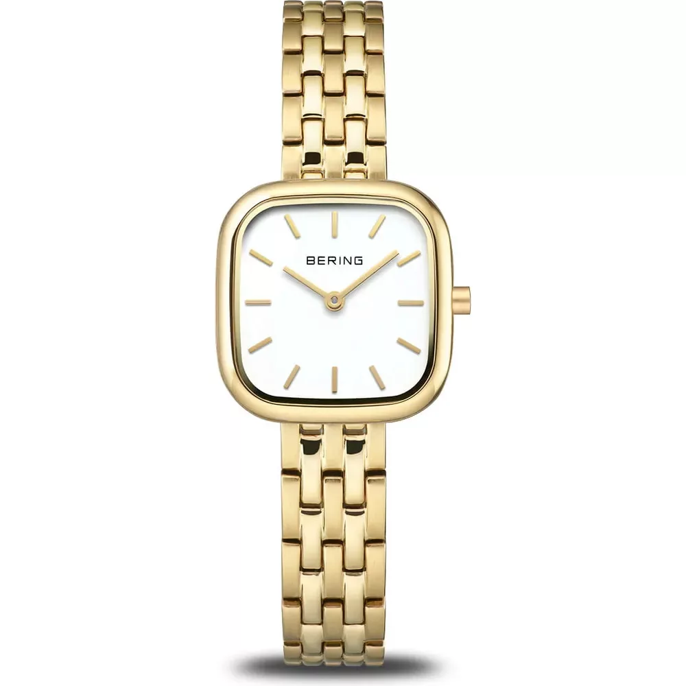 A Bering 17926‑734 női karóra a Classic kollekció letisztult, skandináv eleganciájának ragyogó képviselője. A 26 mm-es tok és az arany tónusú rozsdamentes acél szíj harmonikus összhangot teremtenek a fehér, baton indexes számlappal.