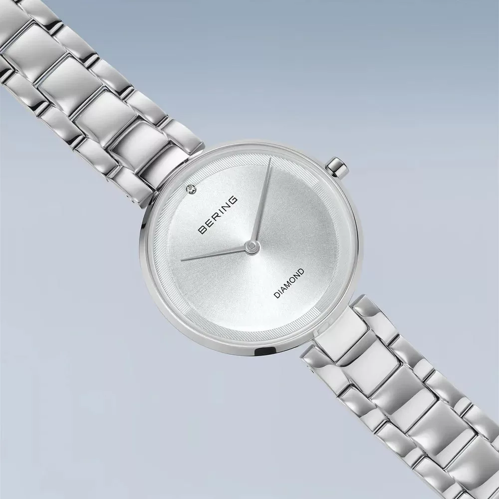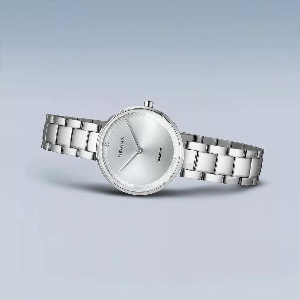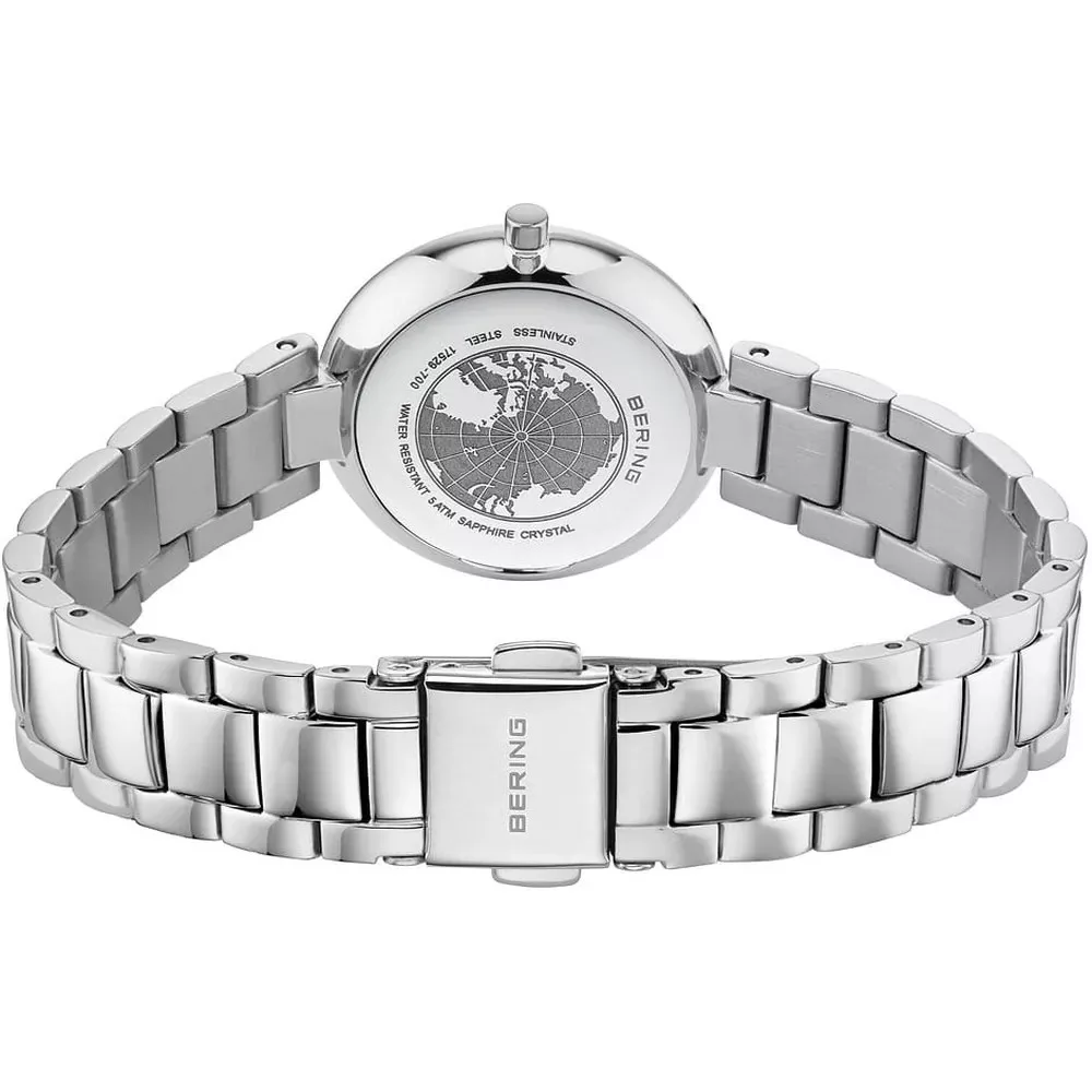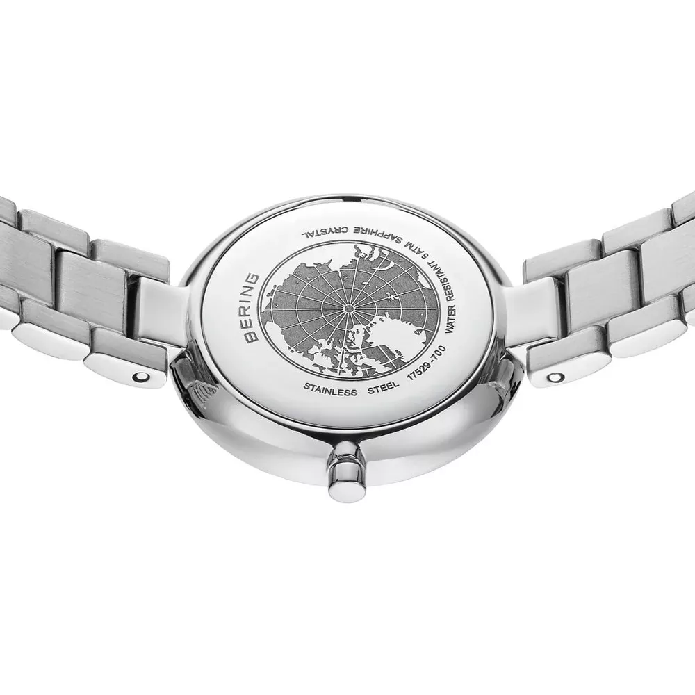A Bering Classic 17529-700 elegáns női karóra rozsdamentes acél tokkal és szíjjal, zafír üveggel, 29 mm átmérővel és 50 m vízállósággal. Minimalista design, egyetlen kristály a 12 óránál.