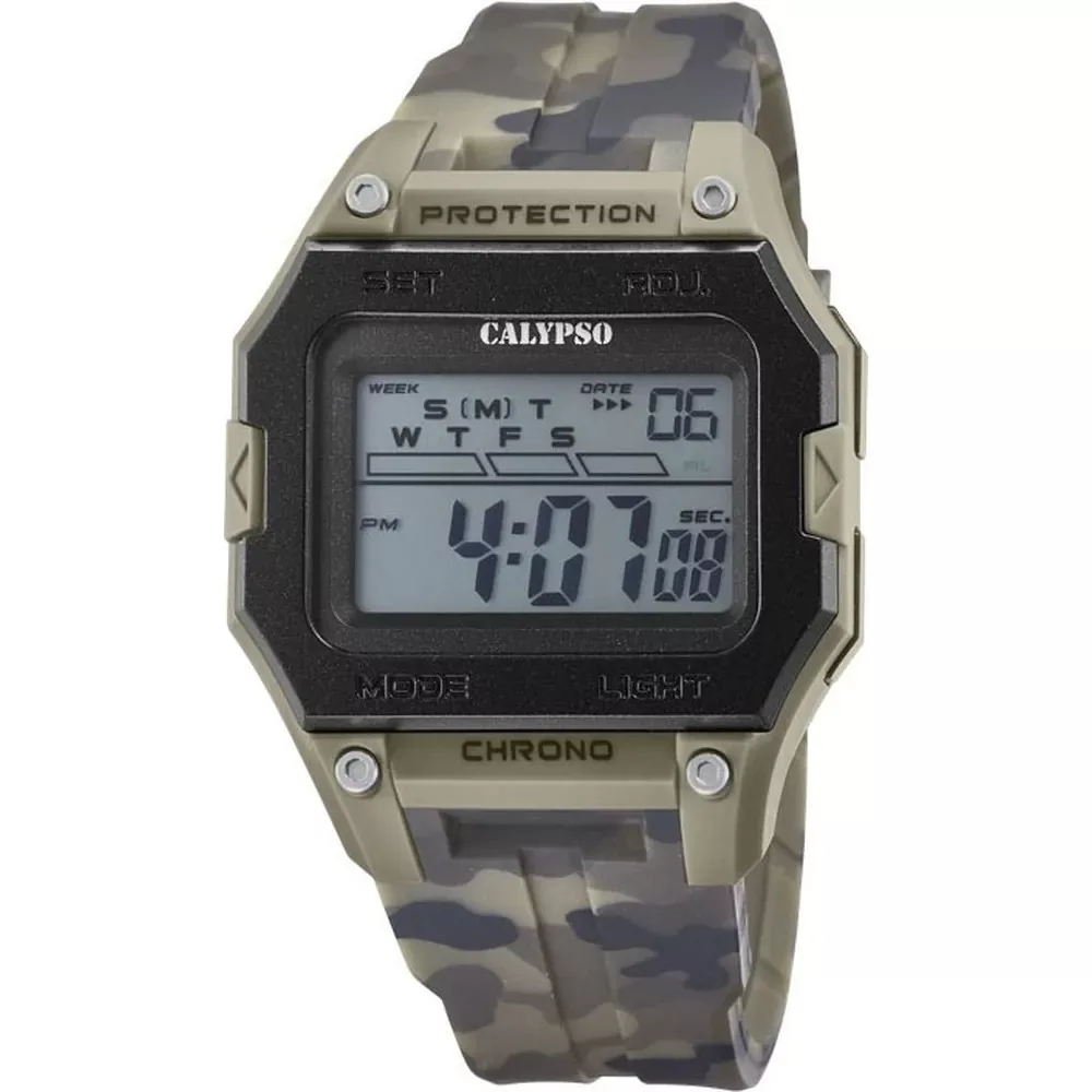 A Calypso K5810/3 digitális tinióra a sportos, lendületes megjelenést kedvelőknek készült: masszív 44,85 mm tok műanyagból, katonai zöld (military) szíjjal, amely fiatalos energiát kölcsönöz viselőjének.