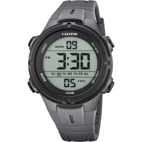 Calypso K5837/4 digitális tinióra szürke műanyag szíjjal és fekete számlappal. Funkciók: dátum, ébresztés, világítás, stopper, visszaszámlálás, második időzóna, 100 m vízálló – sportos és praktikus választás.