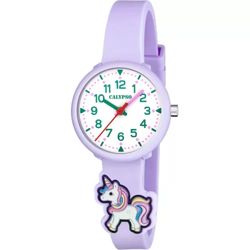 Calypso K5844/4 tinióra – analóg, lila műanyag tok és szíj, fehér számlap, könnyű, vízálló 30 m