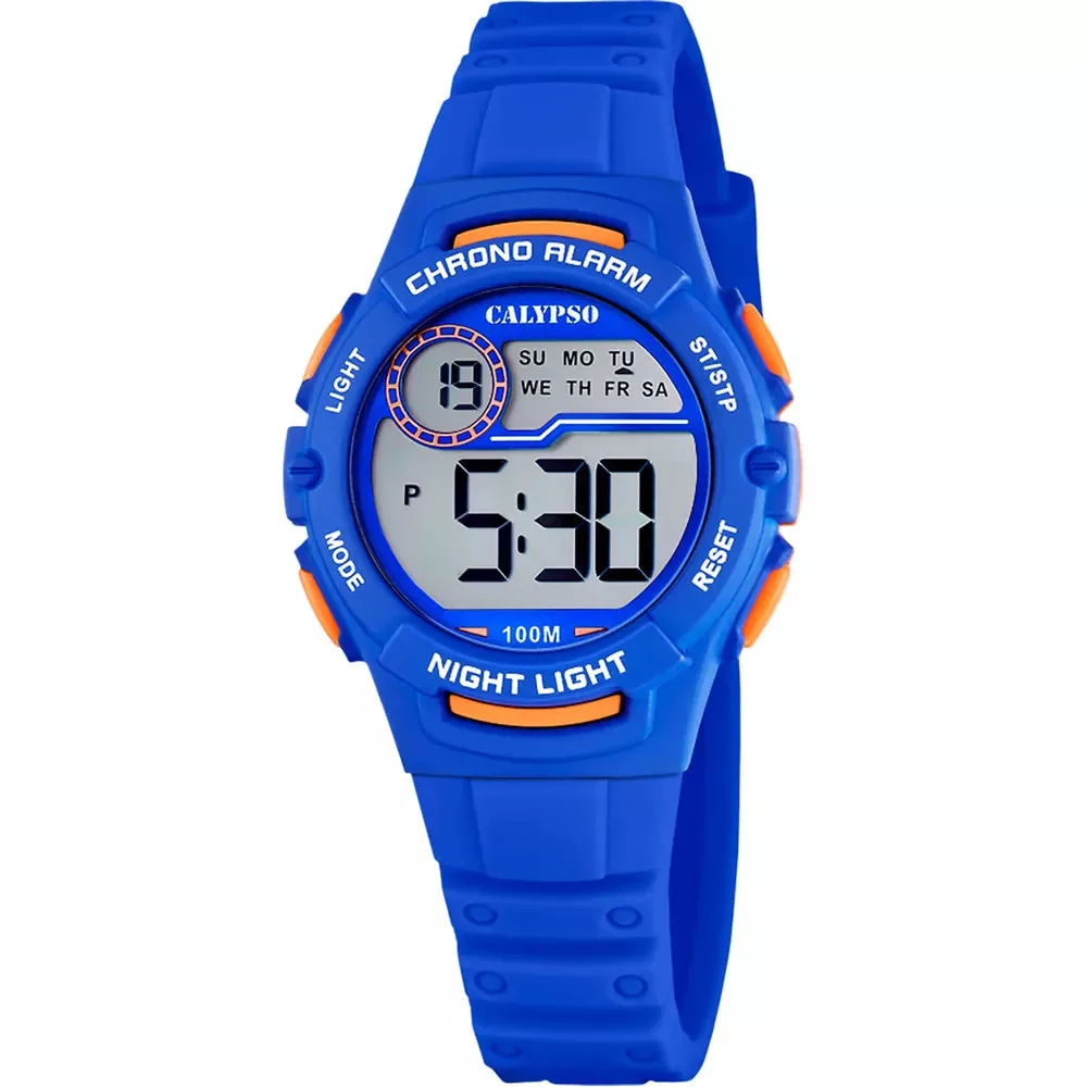 A Calypso K5852/3 digitális tinióra frissebb hangulatot ad a mindennapokhoz: strapabíró kék műanyag tok és szíj, élénk kék-narancssárga kijelző, amely jól olvasható éjjel is az EL-világításnak köszönhetően.