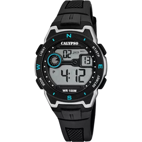 Calypso K5853/4 digitális tinióra fekete műanyag tokban és szíjjal. Funkciók: dátum, ébresztő, világítás, stopper, második időzóna, 50 m vízálló – modern, praktikus és könnyen használható, eredeti csomagolásban.