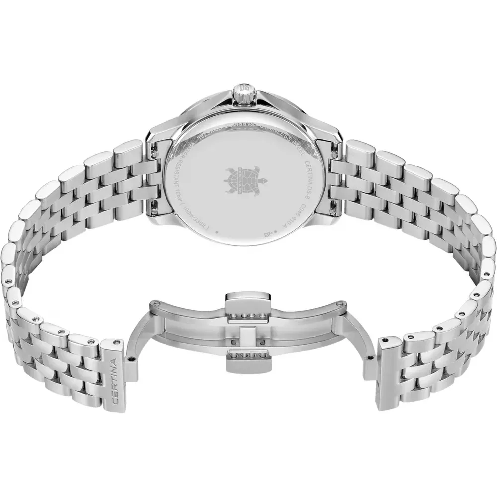 A Certina DS-8 Lady finoman kidolgozott, letisztult megjelenése tökéletesen illeszkedik az elegáns női stílushoz. Az acél tok és a világos számlap harmonikus, arany-ezüst hatású eleganciát sugároz, amely könnyedén kombinálható mindennapi viselettel vagy alkalmi öltözettel is.