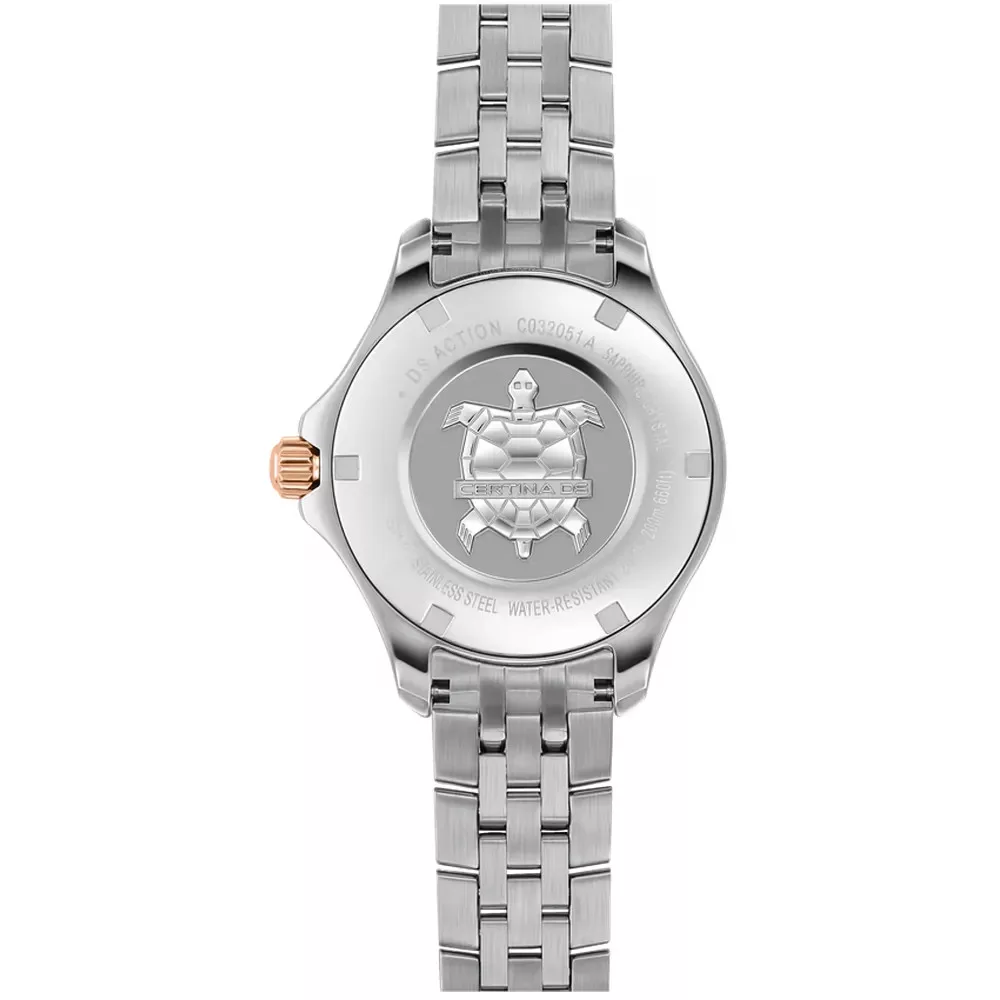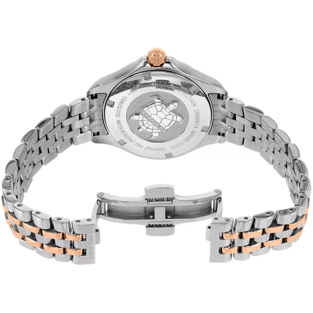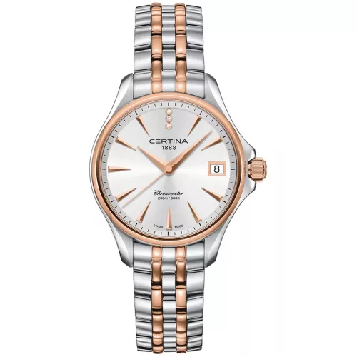 A Certina DS Action Lady Diamonds modell a klasszikus női eleganciát ötvözi a sportos strapabírással. Az arany-ezüst tónusú acél tok és szíj harmonikus megjelenést biztosít, míg a gyémánt indexek különleges fényt és exkluzív megjelenést adnak a számlapnak. Ez az óra nemcsak kiegészítő, hanem valódi ékszer a csuklón.