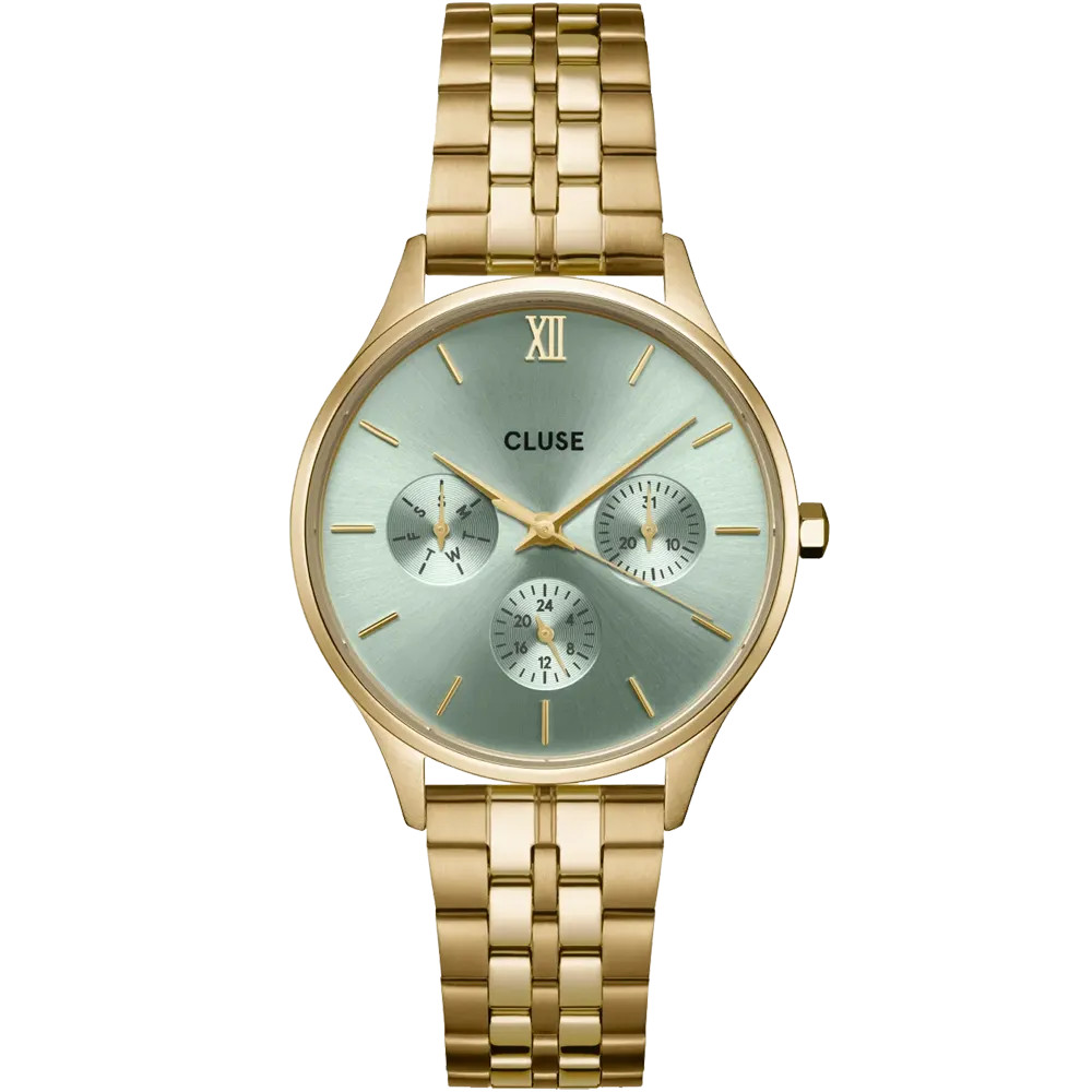 Cluse CW10709 a Minuit Multifunction kollekció kiemelkedő darabja, mely összeköti a klasszikus design és modern funkcionalitás elemeit. A 34 mm-es arany tok stílust ad, míg a zsályazöld (sage green) számlap elegáns, napsugaras felületű ábrázolást kapott. Dizájn: kerek forma, finom indexek, arany mutatók és letisztult elrendezés.