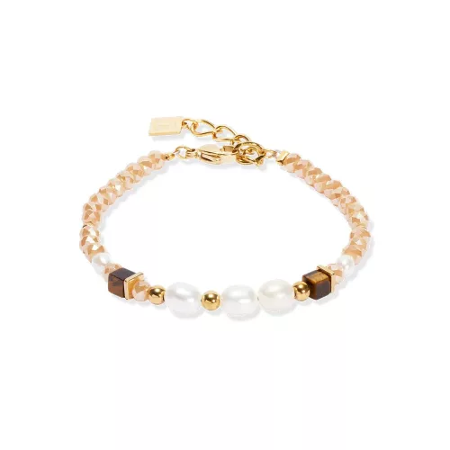 Coeur de Lion 1135/30-1110 Cosmic Pearls karkötő sárga-arany színben fehér Édesvízi Gyönggyel, Tigrisszemmel és csiszolt üveggel.