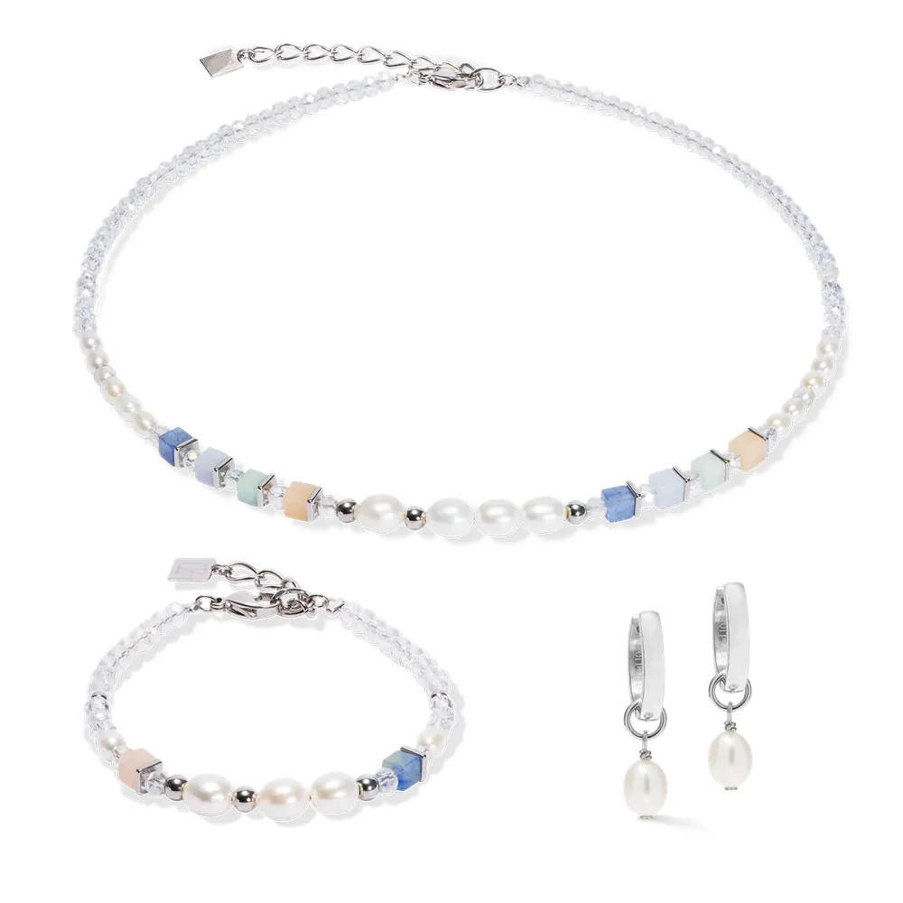 Légies, könnyed és egyszerűen elbűvölő - a Cosmic Pearls puha ezüst karkötő pasztellálmokat varázsol a csuklódra. Középen számos csillogó édesvízi gyöngyöt díszítenek finom kalcedon, amazonit, kék aventurin és rózsaszín aventurin kockák. Az ezüst színű rozsdamentes acél modern, friss hatást kölcsönöz. Tökéletes játékos megjelenéshez vagy visszafogott tekintetgyönyörködtető darabnak!