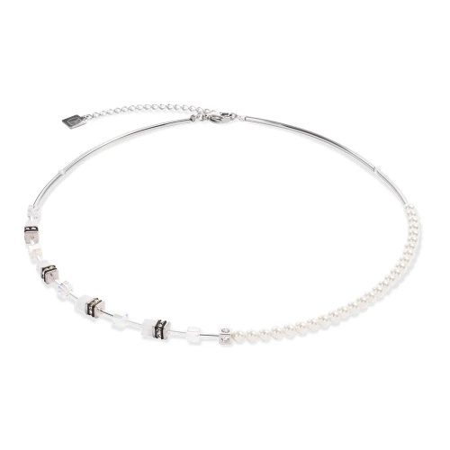Coeur de Lion 4087/10-1417 GeoCube Mini Fusion Pearls nyaklánc fehér és ezüst színben szintetikus Tigrisszemmel, Édesvízi gyönggyel és Swarovski kristályokkal.