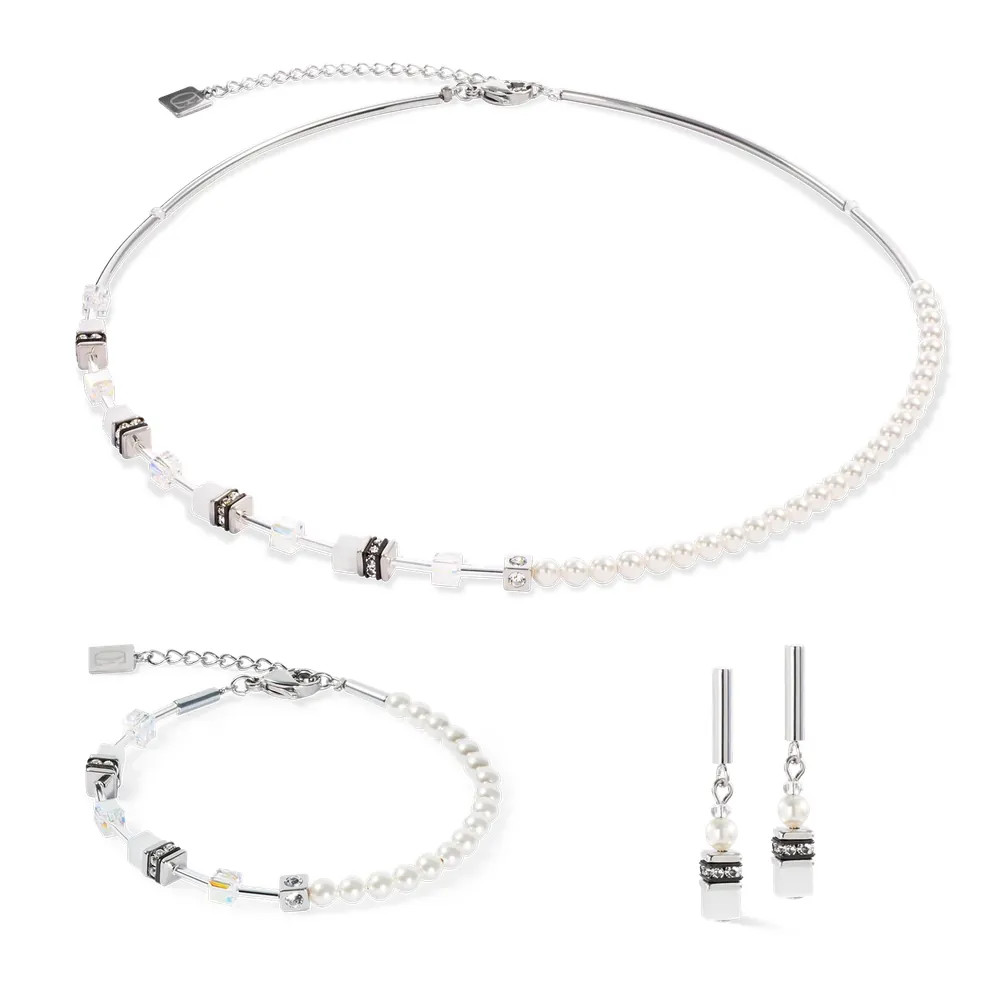 Finom, filigrán, tökéletes minden napra - a GeoCUBE® Mini Fusion Pearls ezüst-fehér karkötő harmonizál a Swarovski® Crystal Pearls elegáns egyszerűségével a GeoCUBE® elemek letisztult struktúrájával. A csillogó fehér árnyalatok és a kiváló minőségű ezüst rozsdamentes acél kombinációja modern, kifinomult megjelenést kölcsönöz a karkötőnek. Kötelező darab mindenkinek, aki szereti a visszafogott eleganciát!