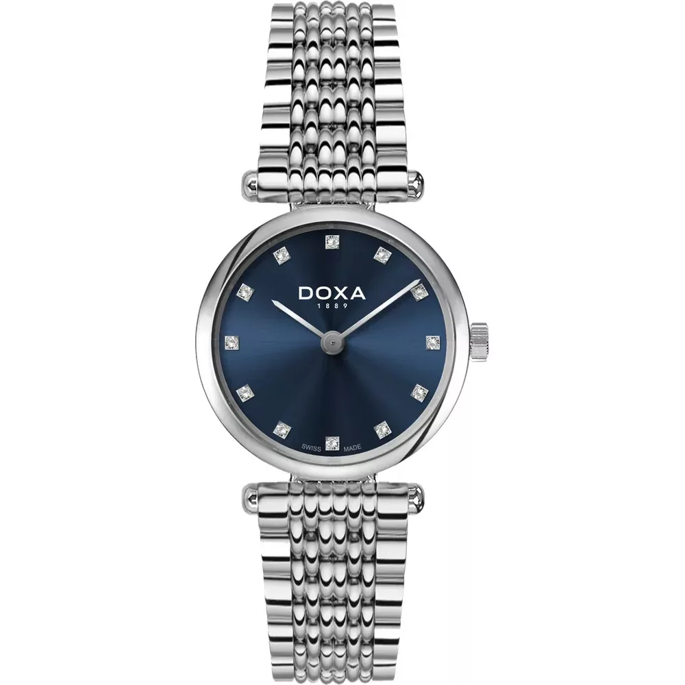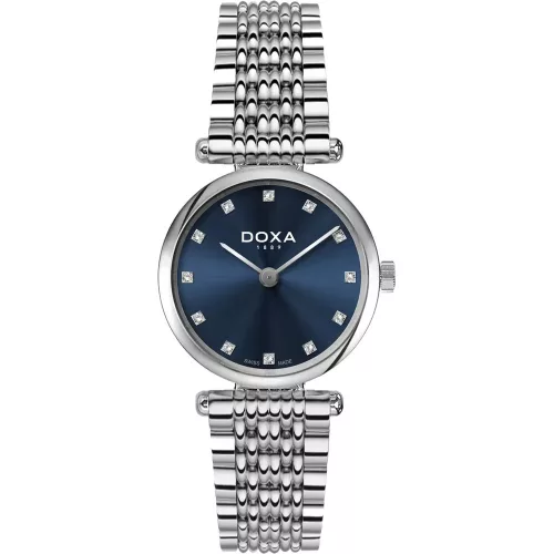 Doxa D‑Lux 111.15.208.10 női karóra 24 mm rozsdamentes acél tokban, kék sunray számlappal kristály díszítéssel, saphir üveggel, Swiss quartz szerkezettel és 30 m vízállósággal – elegancia apró részletekben.