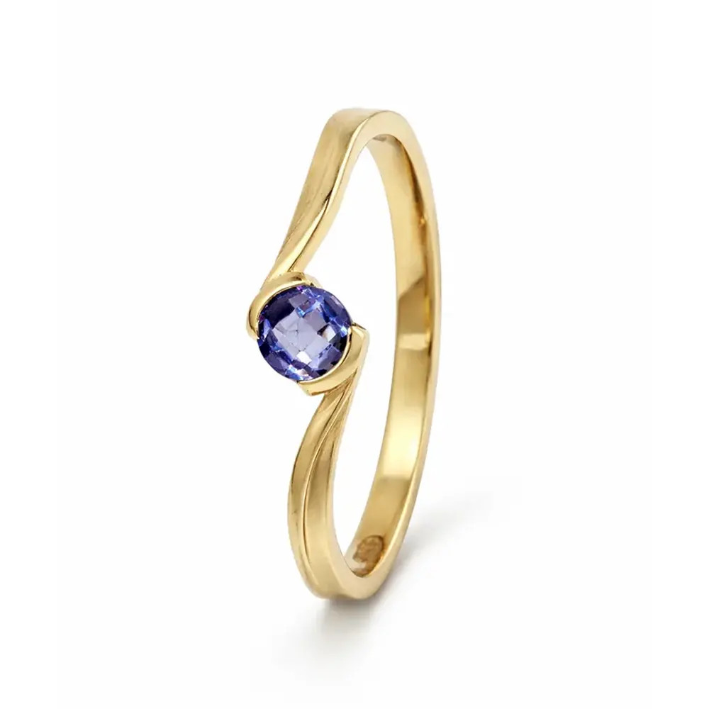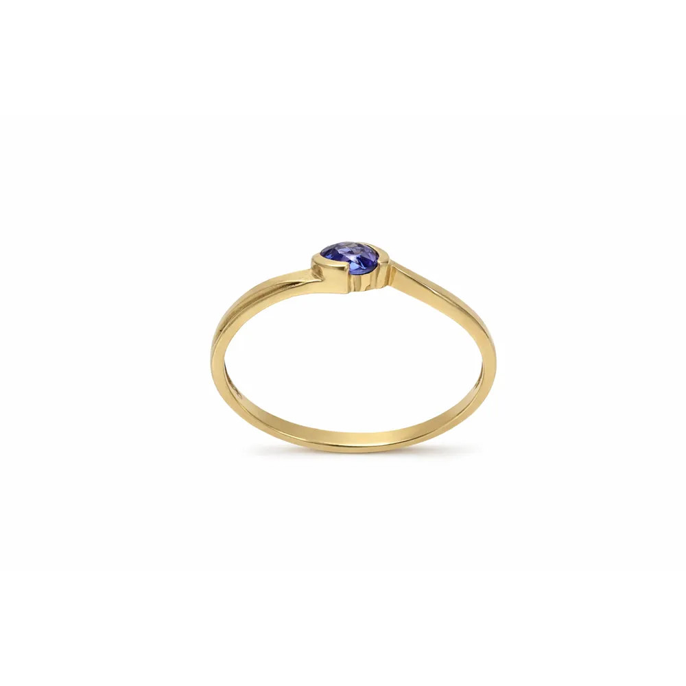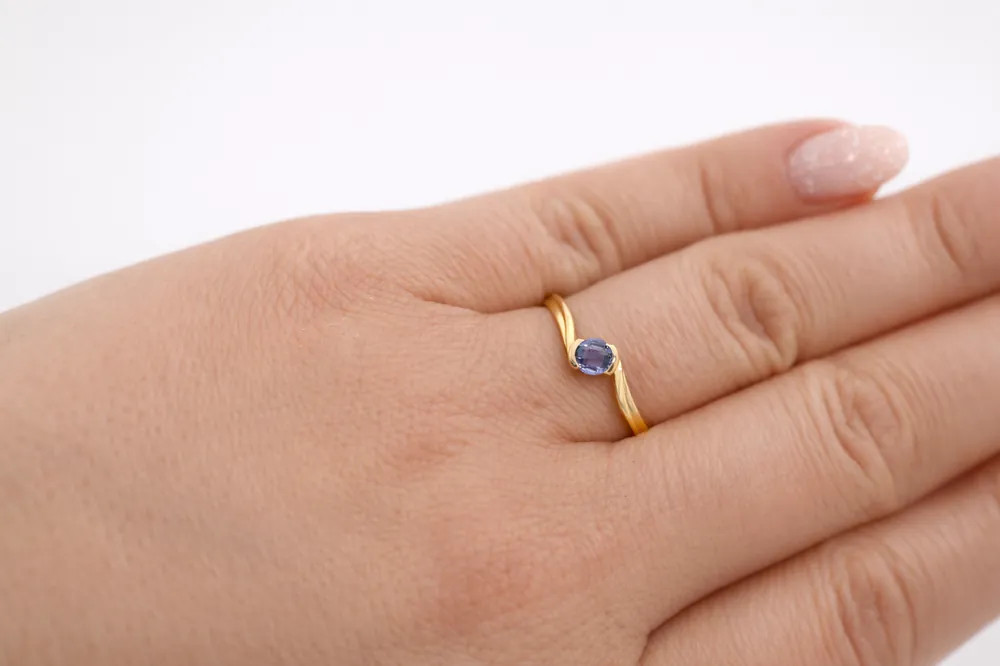 Különleges ragyogás egyedi formában - liláskék cirkon kővel díszített arany gyűrű, amely finom csavart kialakításával elegáns és figyelemfelkeltő választás.