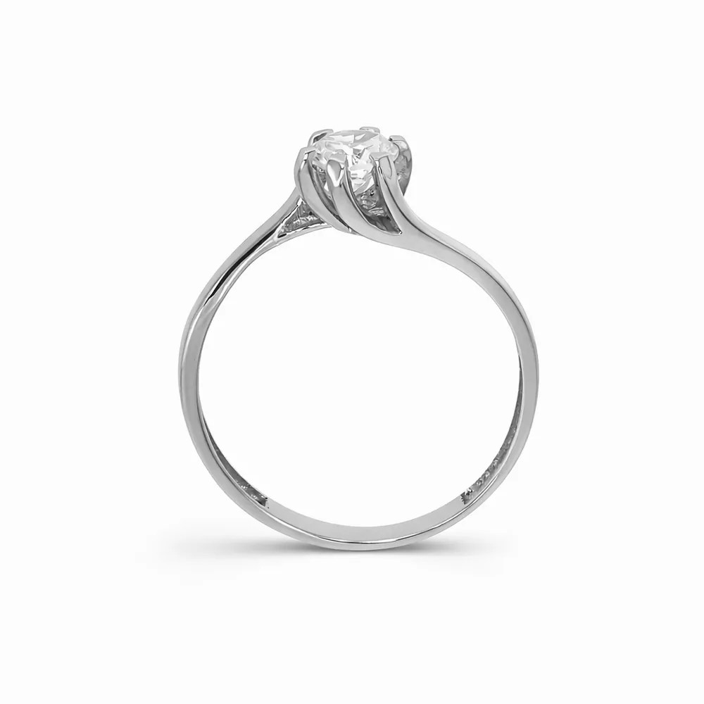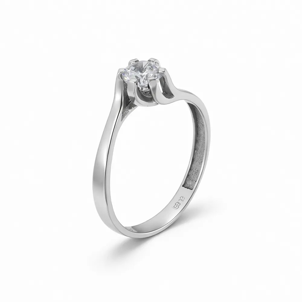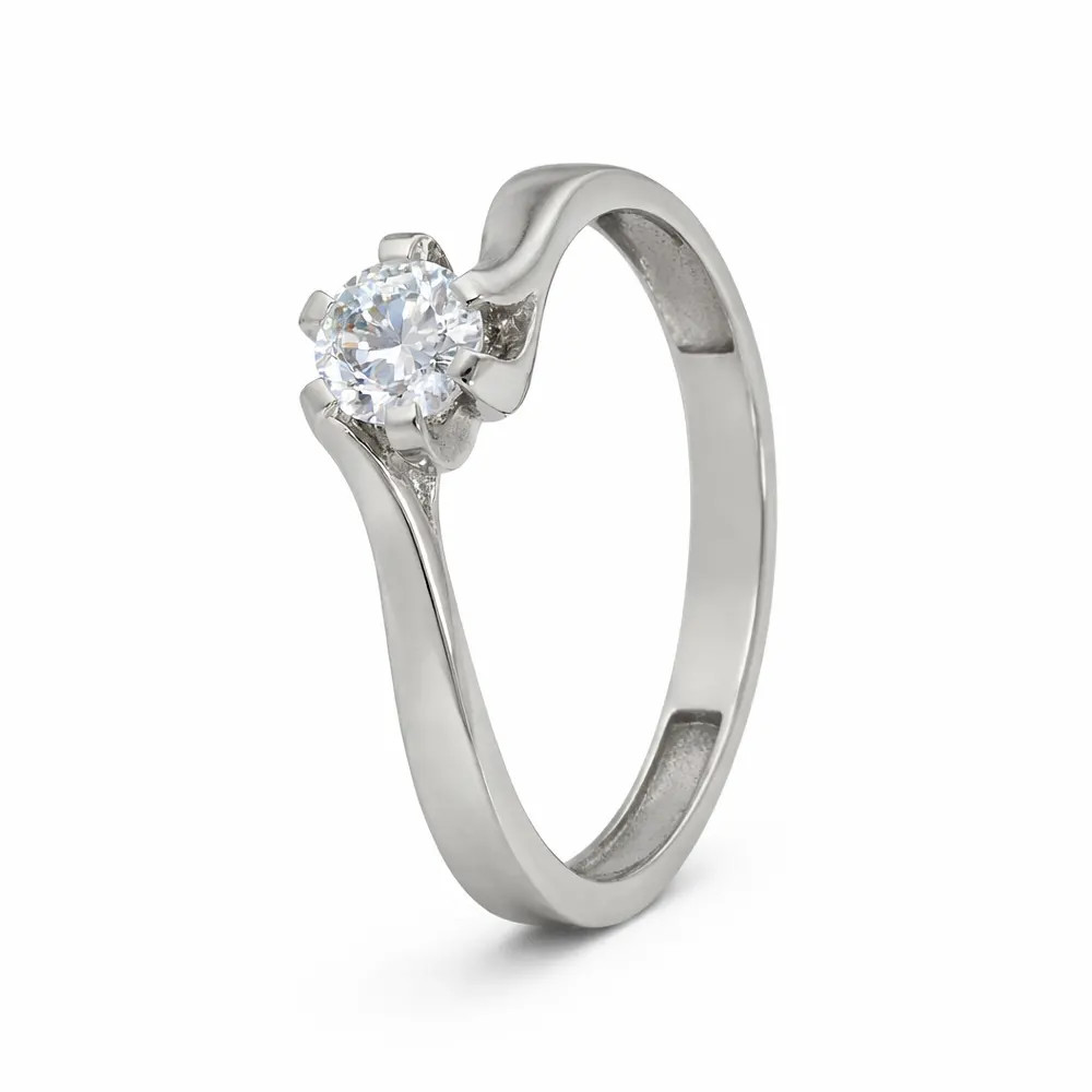 Különleges eljegyzési gyűrű csavart formavilággal és ragyogó cirkon kővel. A 14 karátos fehér arany elegáns, modern megjelenést ad, amely tökéletes választás a nagy pillanat megörökítésére.
