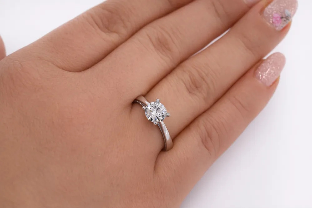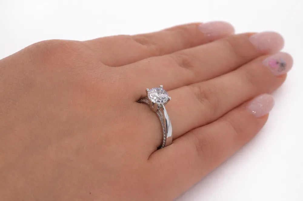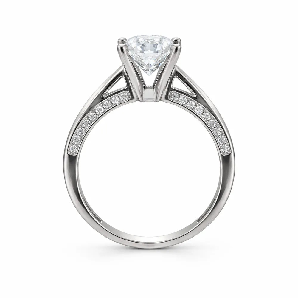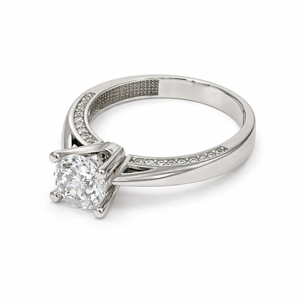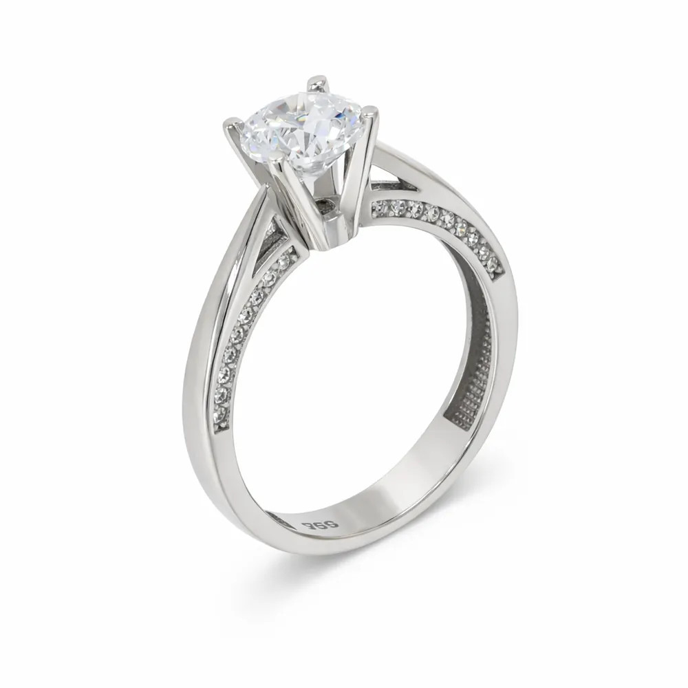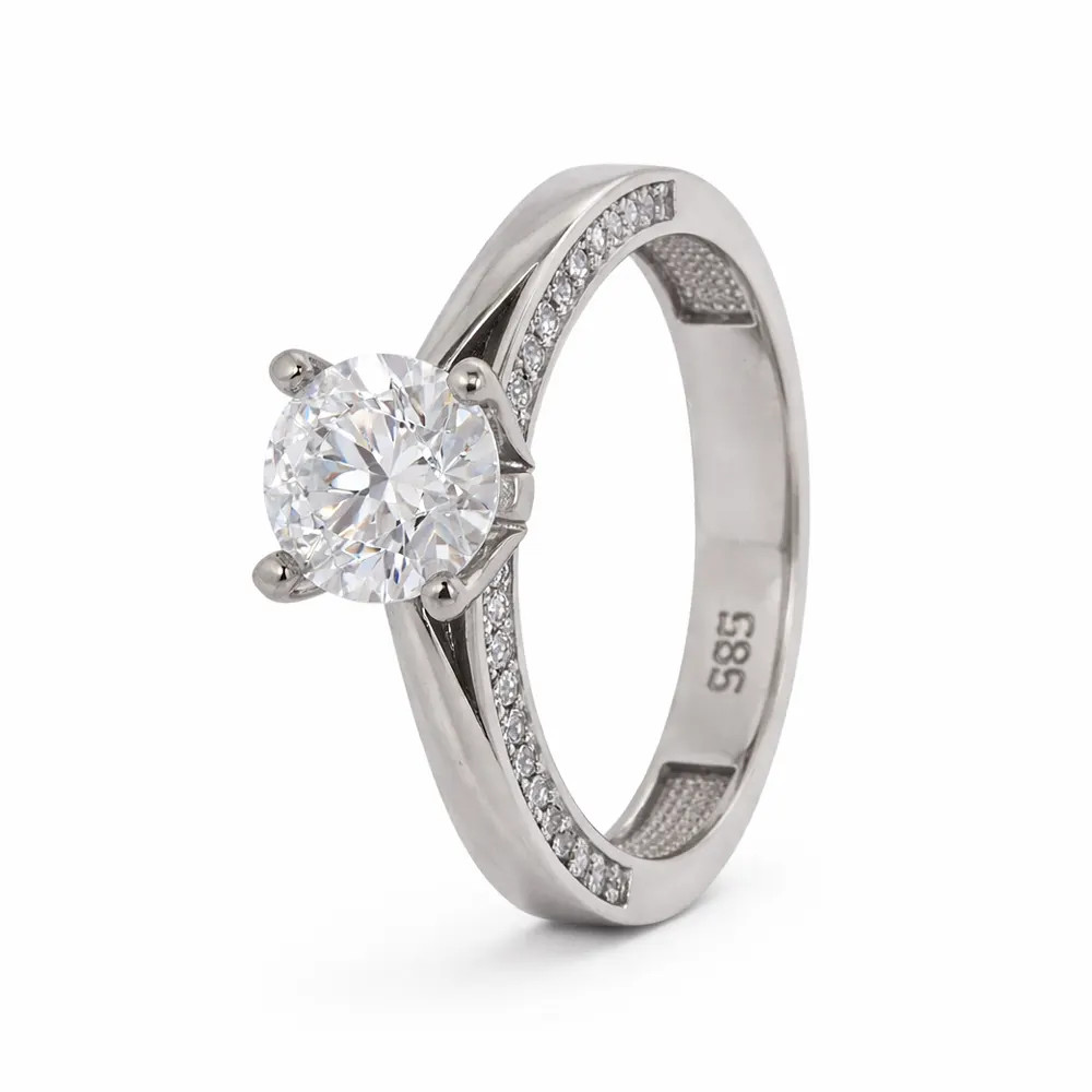 Exkluzív szoliter eljegyzési gyűrű oldal köves díszítéssel, 14 karátos fehér arany - 90925