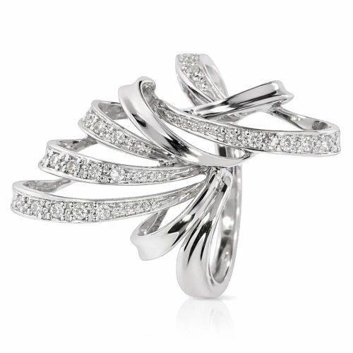 Látványos fehér arany gyűrű több sorban ragyogó gyémánt kövekkel. A masni jellegű forma exkluzív és nőies megjelenést biztosít, így ideális választás különleges alkalmakra vagy elegáns mindennapi viselethez.