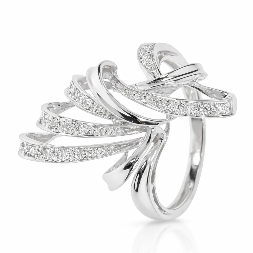 A gyűrű masni jellegű kialakítása elegáns és nőies karaktert ad a megjelenésnek, miközben modern, dinamikus formája igazán egyedivé teszi viselője stílusát. A fényes polírozott fehér arany felület kiemeli a gyémántok ragyogását és különleges fényjátékot biztosít.