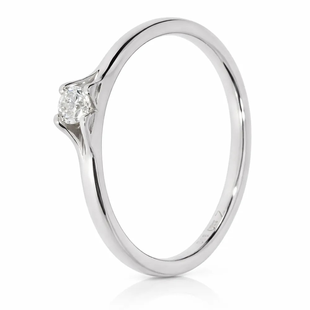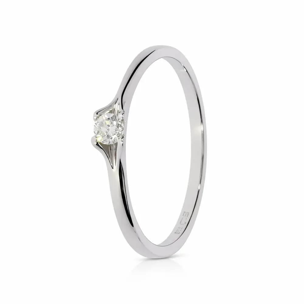 Ez a 14 karátos fehér arany gyűrű a klasszikus elegancia és a modern nőies formavilág harmonikus találkozása. A gyűrű középpontjában egy ragyogó 0,115 ct G-VSI tisztaságú gyémánt található, amely finom foglalatban kapott helyet, így maximálisan érvényesül természetes csillogása.