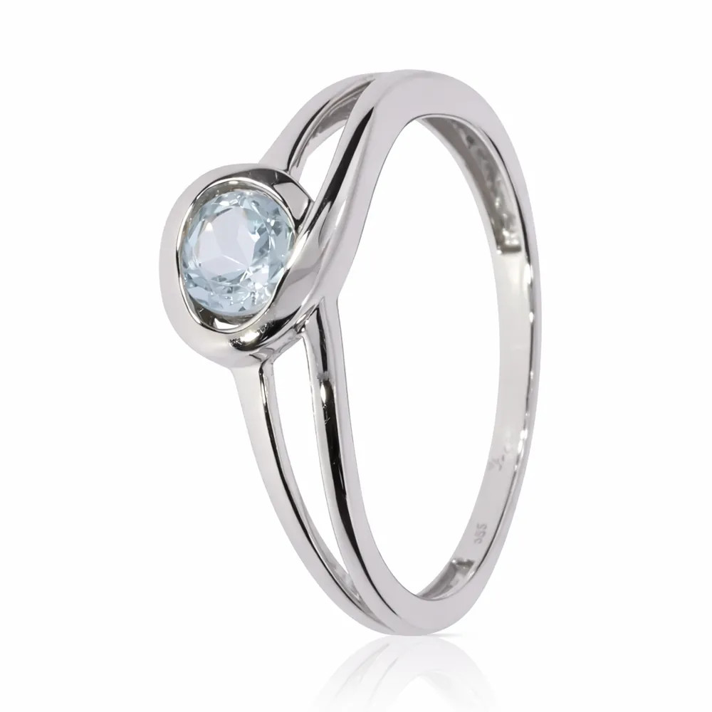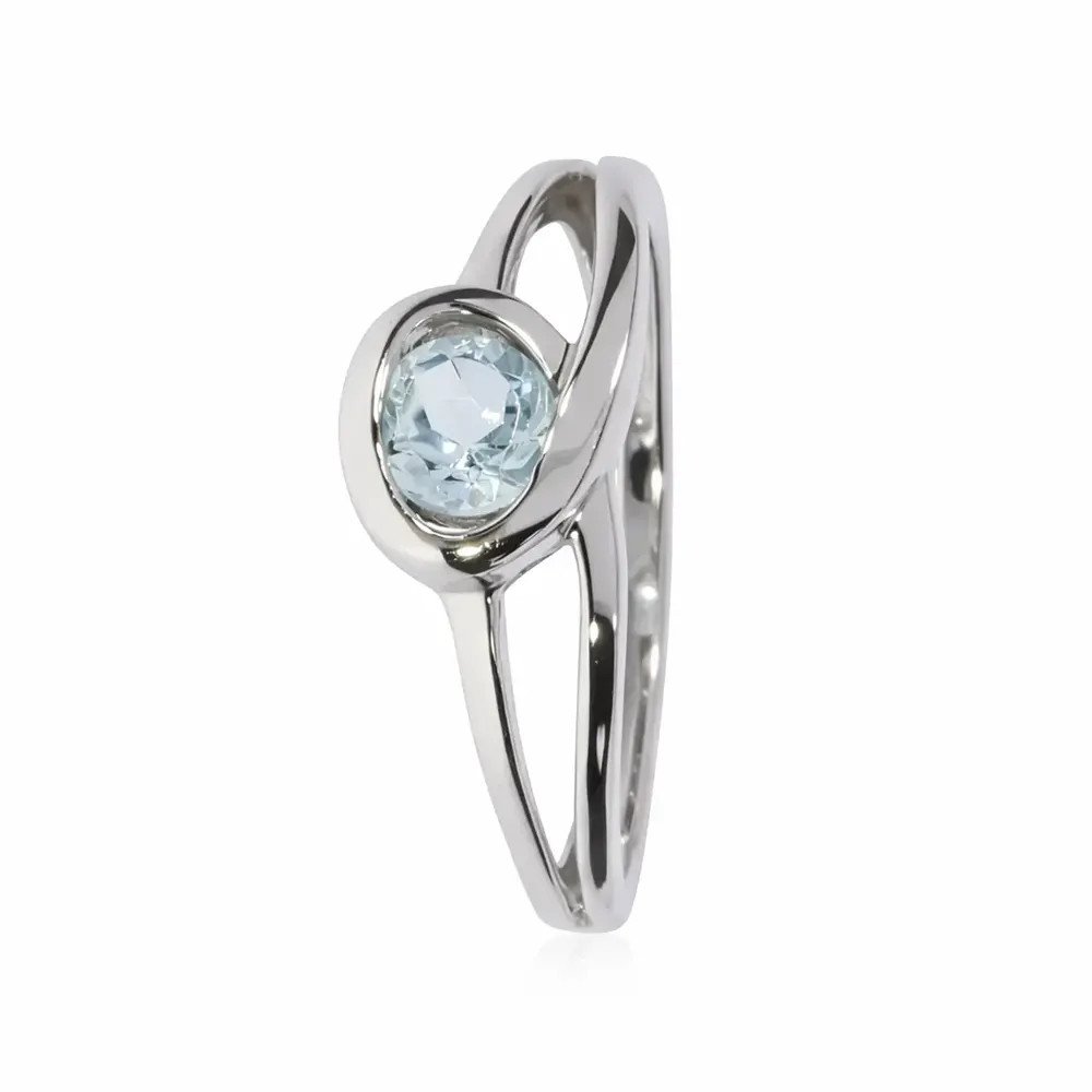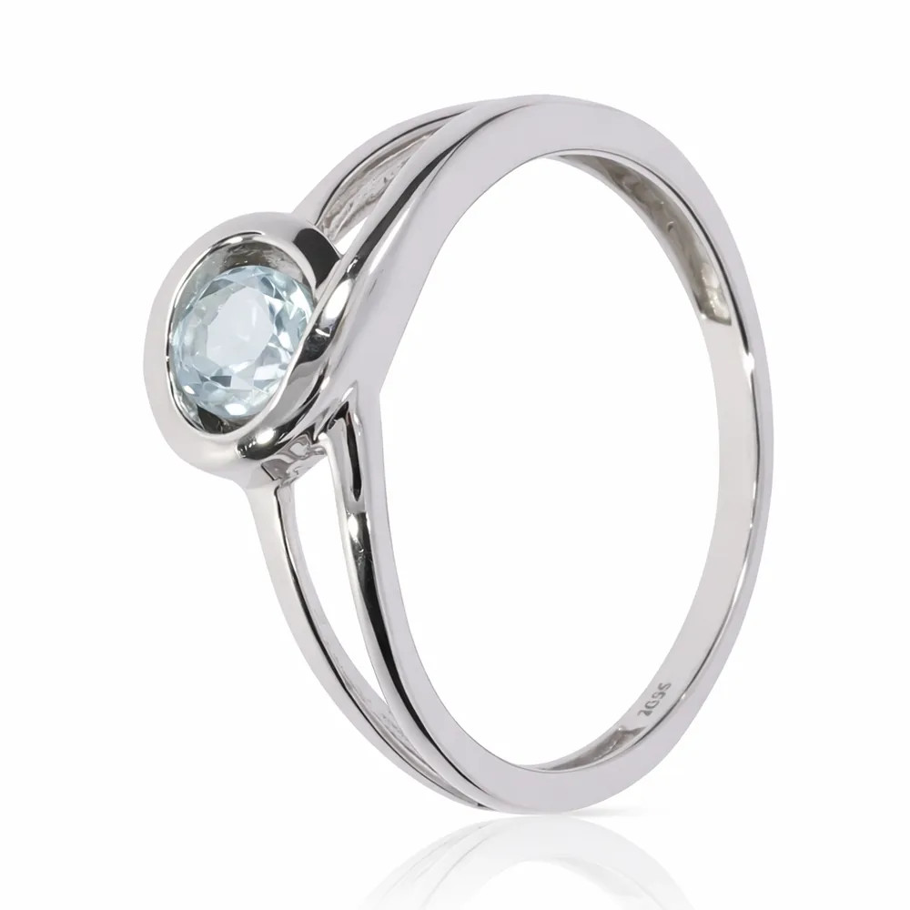 Kifinomult fehér arany gyűrű világoskék topáz kővel. Az áttört kialakítás és a finoman ragyogó kő légies eleganciát kölcsönöz, így ideális választás eljegyzéshez vagy stílusos mindennapi viselethez.
