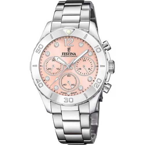 A Festina F20603/7 női kronográf megjelenésével és funkcióival azonnal magára vonja a figyelmet. A 39 mm átmérőjű, rozsdamentes acél tok letisztult vonalai és a finoman csillogó pink számlap elegáns párost alkotnak.