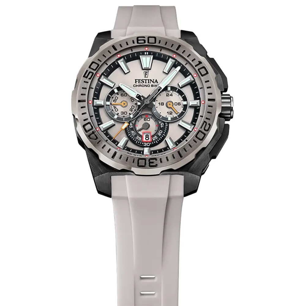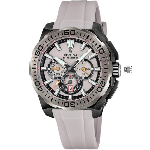 A Festina Chrono Bike F20726/1 férfi kronográf karóra szürke szilikon szíjjal, szürke/fekete számlappal, stopperrel, dátum kijelzéssel és 200 m vízállósággal.