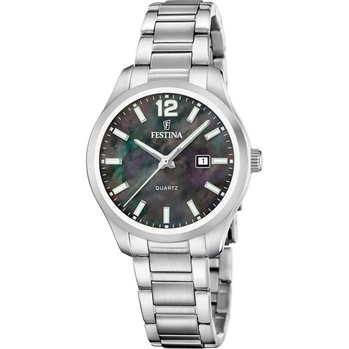 F20737/7 – elegáns analóg quartz női karóra, 34 mm acéltokkal, fekete gyöngyház számlappal, dátumfunkcióval és 5 ATM vízállósággal. Gyöngyházfényben ragyogó elegancia, mindennapi viselethez.
