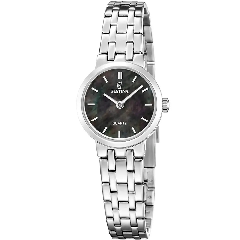 A Festina Mademoiselle F20746/6 női karóra fekete gyöngyház számlappal, rozsdamentes acél tokkal és csattal, kvarc szerkezettel és 50 m vízállósággal – elegáns, minden napra is ideális.