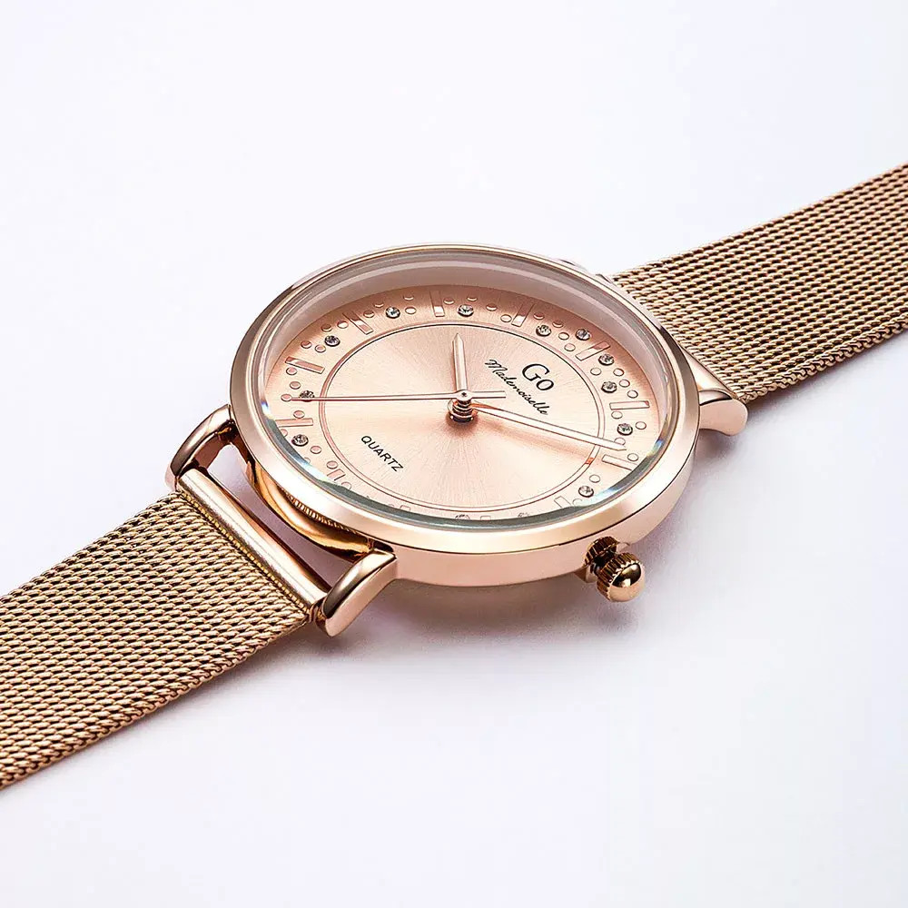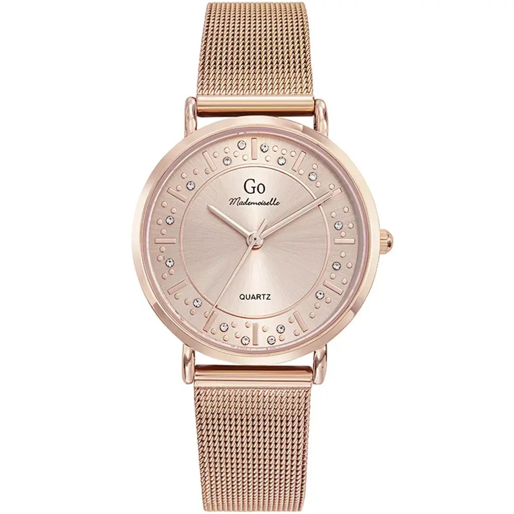 A GO 695600 női karóra rozé arany acél tokkal és szíjjal, pontos kvarc szerkezettel, analóg kijelzéssel és 30M vízállósággal – divatos, mindennapi választás.