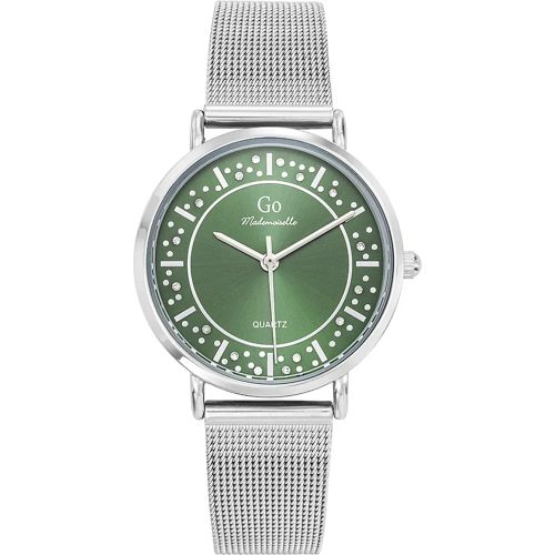 A GO Mademoiselle 695590 női karóra ezüst tokban, zöld számlappal, cirkónia díszítéssel és Miyota quartz szerkezettel – elegáns, finom részletekkel.