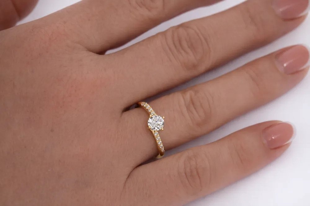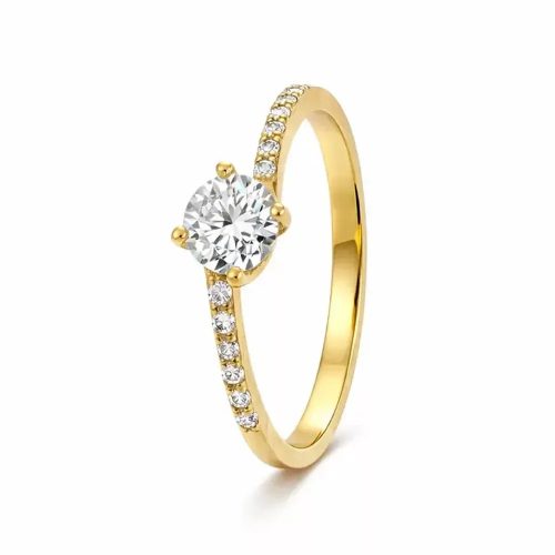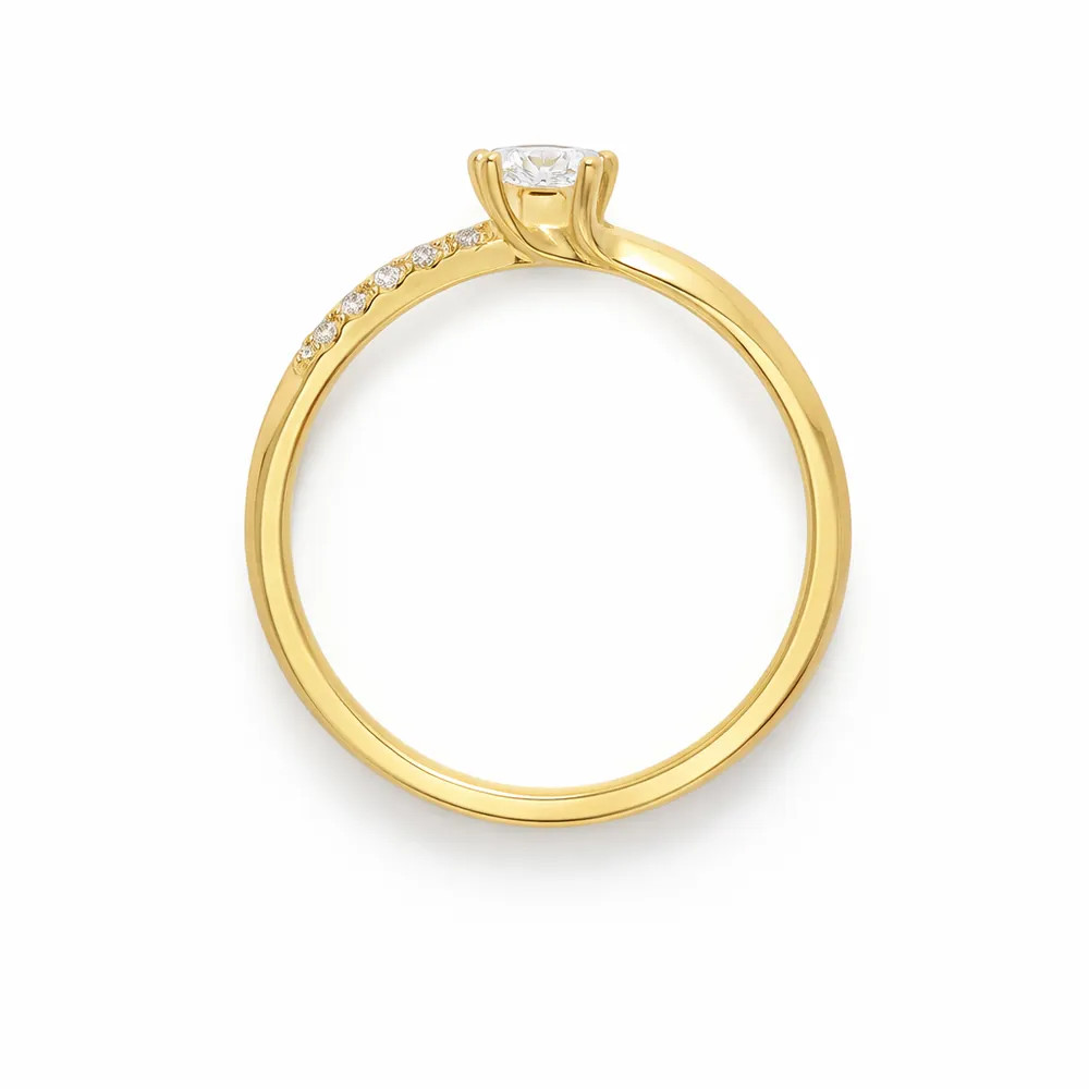 Kiemelkedő ragyogás finom kősorral - 14 karátos arany eljegyzési gyűrű központi cirkon kővel és oldalt elhelyezett csillogó kövekkel.