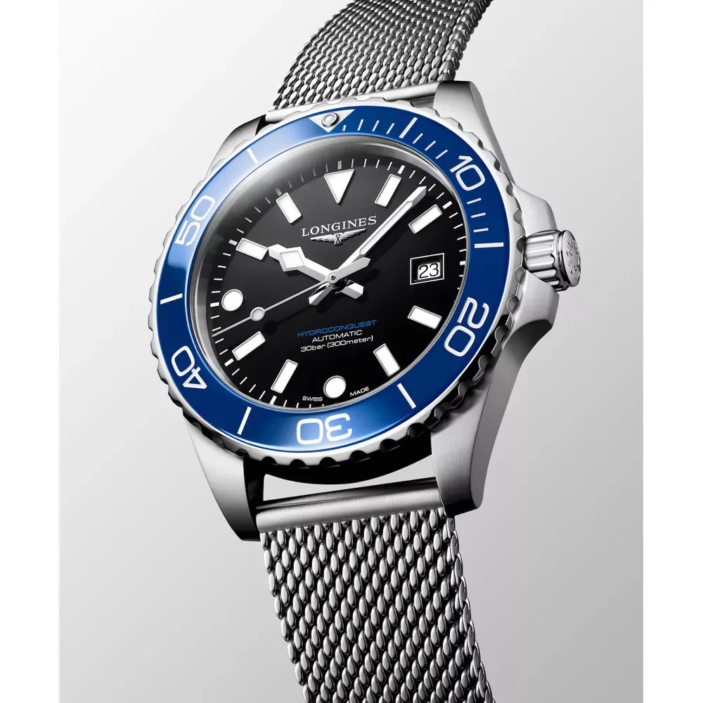 A HydroConquest kollekció egyik legnépszerűbb modellje azok számára készült, akik sportos, mégis elegáns férfi karórát keresnek. A fekete számlap és az acél kialakítás időtálló megjelenést ad, amely könnyedén illeszkedik mindennapi viselethez vagy akár alkalmi megjelenéshez is.