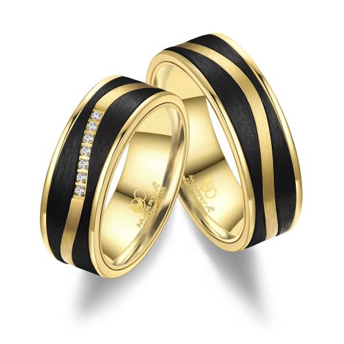 CA‑06 cikkszámú Marrya karikagyűrűpár sárga arany színű acélból, fekete karbon hullám mintával két oldalon. Belső domború kialakítás – elegáns, kényelmes viselet modern pároknak.