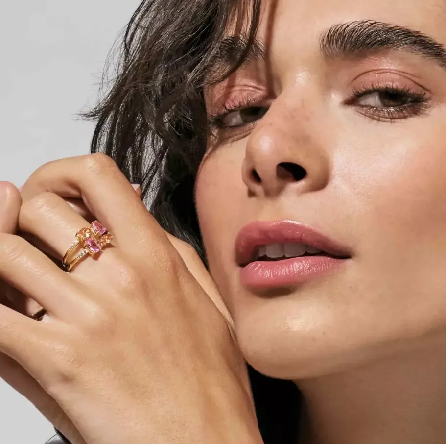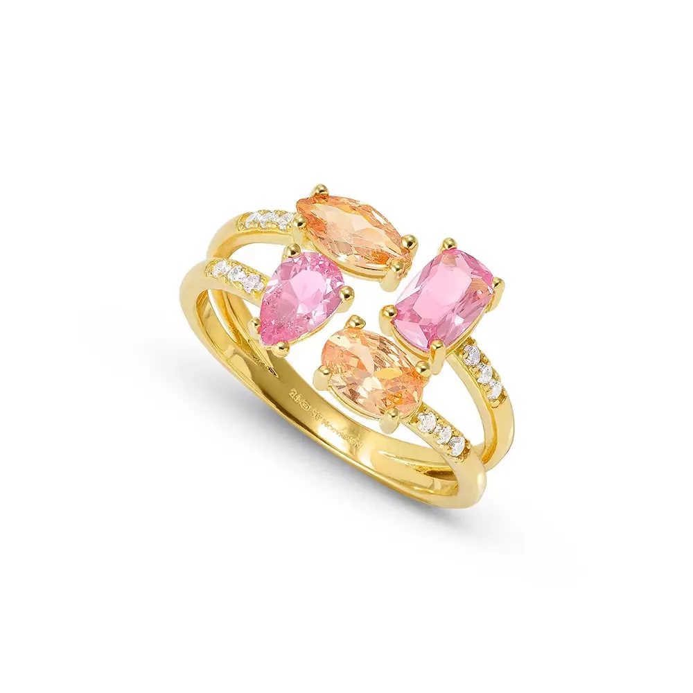 Rózsaszín és pezsgő cirkon kövek A gyűrűt díszítő cirkon kövek rózsaszín, pezsgő és fehér árnyalatban ragyognak. A különböző formájú kövek harmonikus elrendezése modern és nőies karaktert ad az ékszernek.