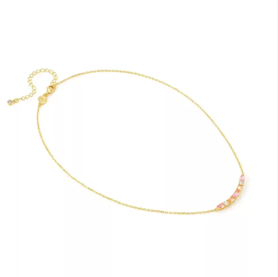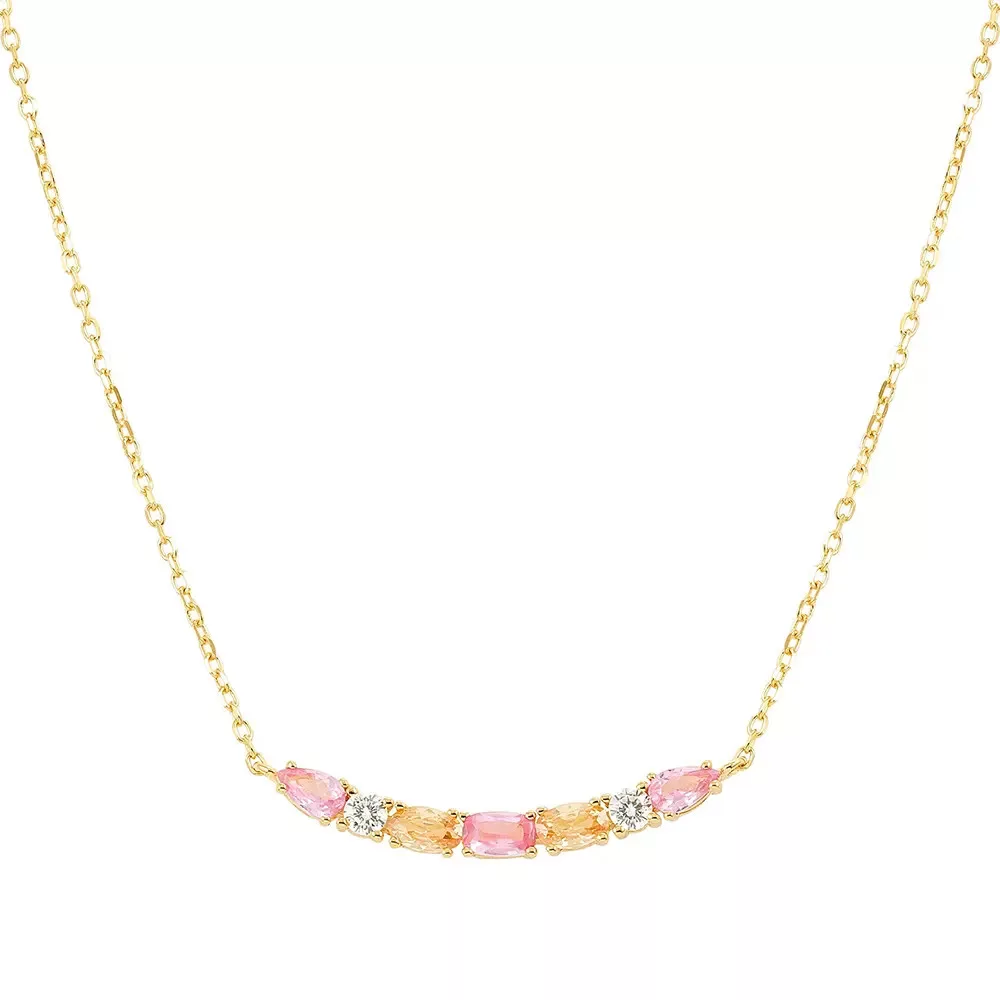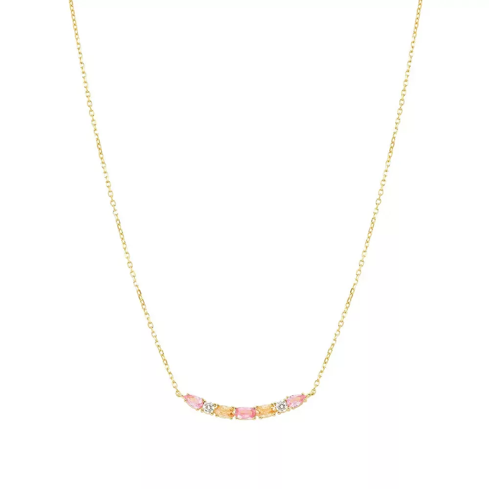 Színes cirkon kövek – elegáns ragyogás A nyakláncot díszítő rózsaszín, pezsgő és fehér cirkon kövek több különböző formában jelennek meg. A kövek fényjátéka modern, nőies karaktert ad az ékszernek.