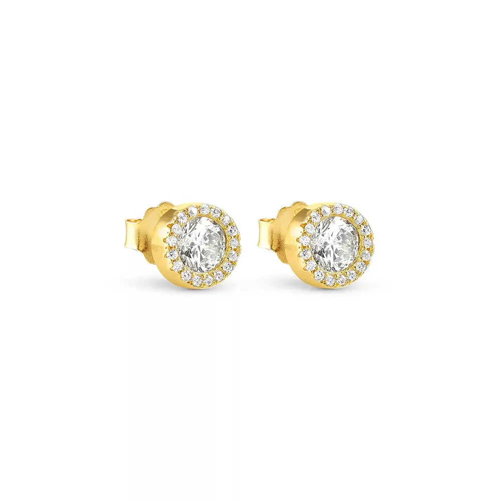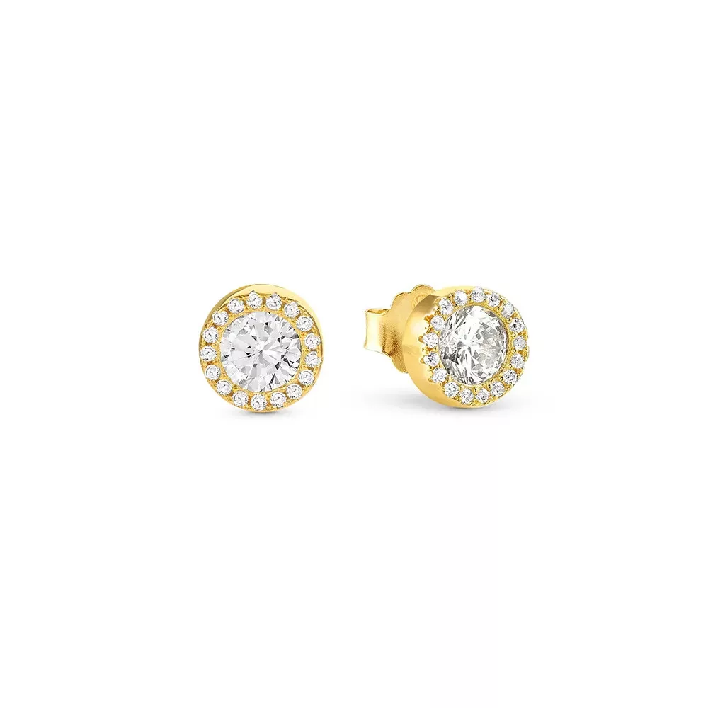 A fülbevalók kerek forma és fehér cirkónia kövek díszítésével ragyognak, miközben a bedugós kialakítás kényelmes és stabil viseletet biztosít. A modell ideális választás mindennapi outfitekhez vagy elegáns eseményekhez egyaránt, és finom csillogást ad viselőjének.
