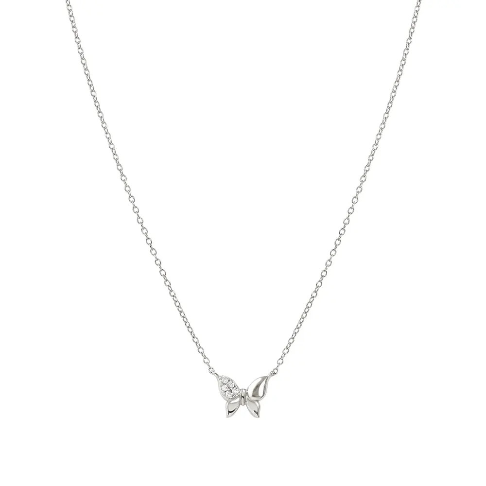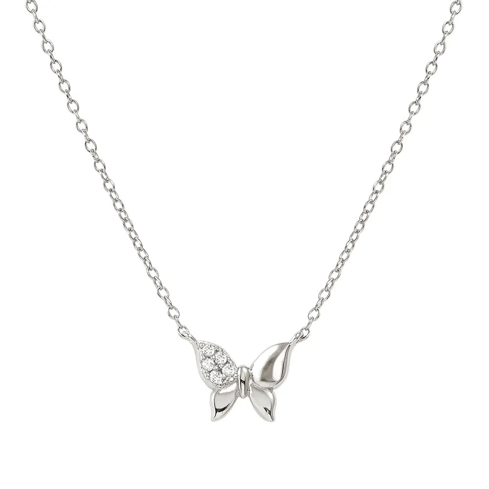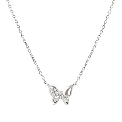 A fém szálra függesztett pillangó medál finoman díszített csillogó fehér cirkónia kövekkel, amelyek minden mozdulatnál visszatükrözik a fényt, így kiemelve a viselője természetes ragyogását és stílusát. Ez a részlet a nyakláncot nőies, finom vonalakkal rendelkező ékszerré teszi, amely akár mindennapi viselethez, akár elegánsabb alkalmakhoz is tökéletes választás.